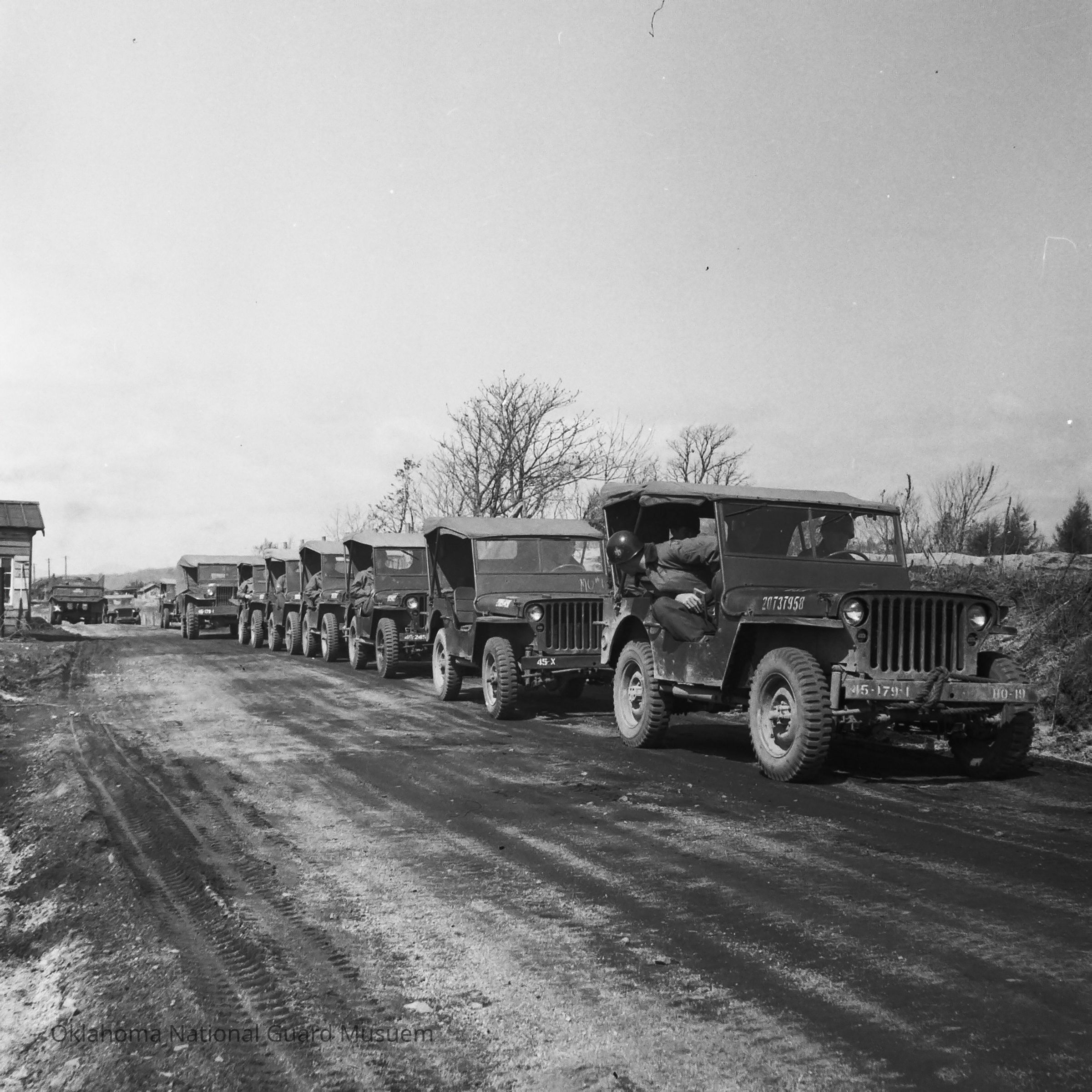 Negative of a Jeep convoy. 179th Infantry