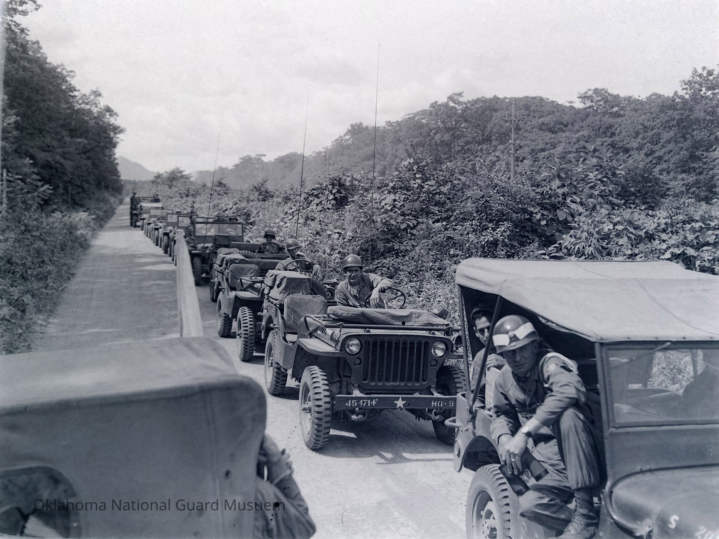 Negative of a Jeep convoy halted along a road on Hokkaido, Japan