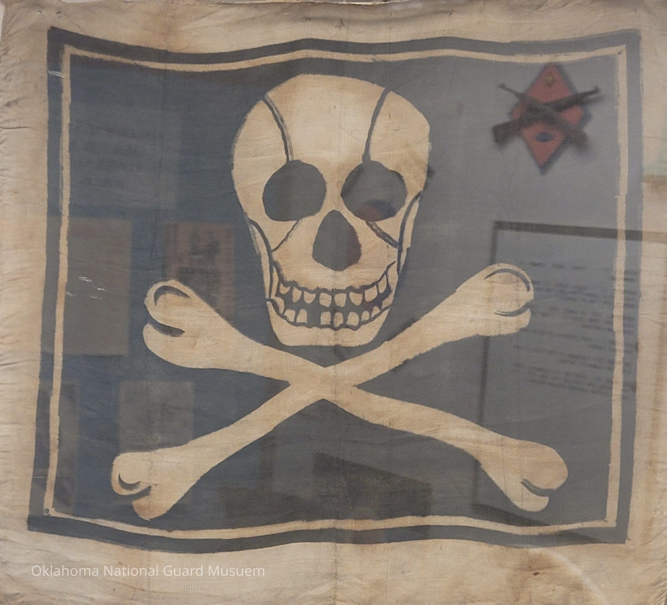 This flag flew off the antenna of a Sherman Tank during the Korean War. The tank, known as the "Jolly Roger" helped repel a Chinese attack on Old Baldy