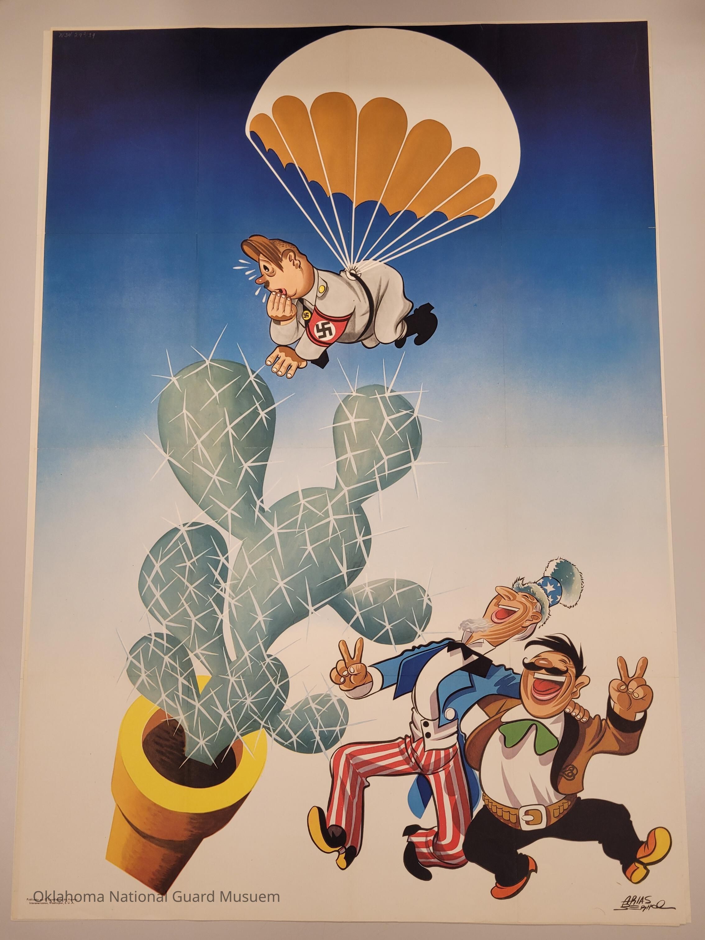 A Spanish language color poster featuring a cartoon illustration of Adolf Hitler parachuting onto a cactus while Mexico and Uncle Sam embrace and laughContext