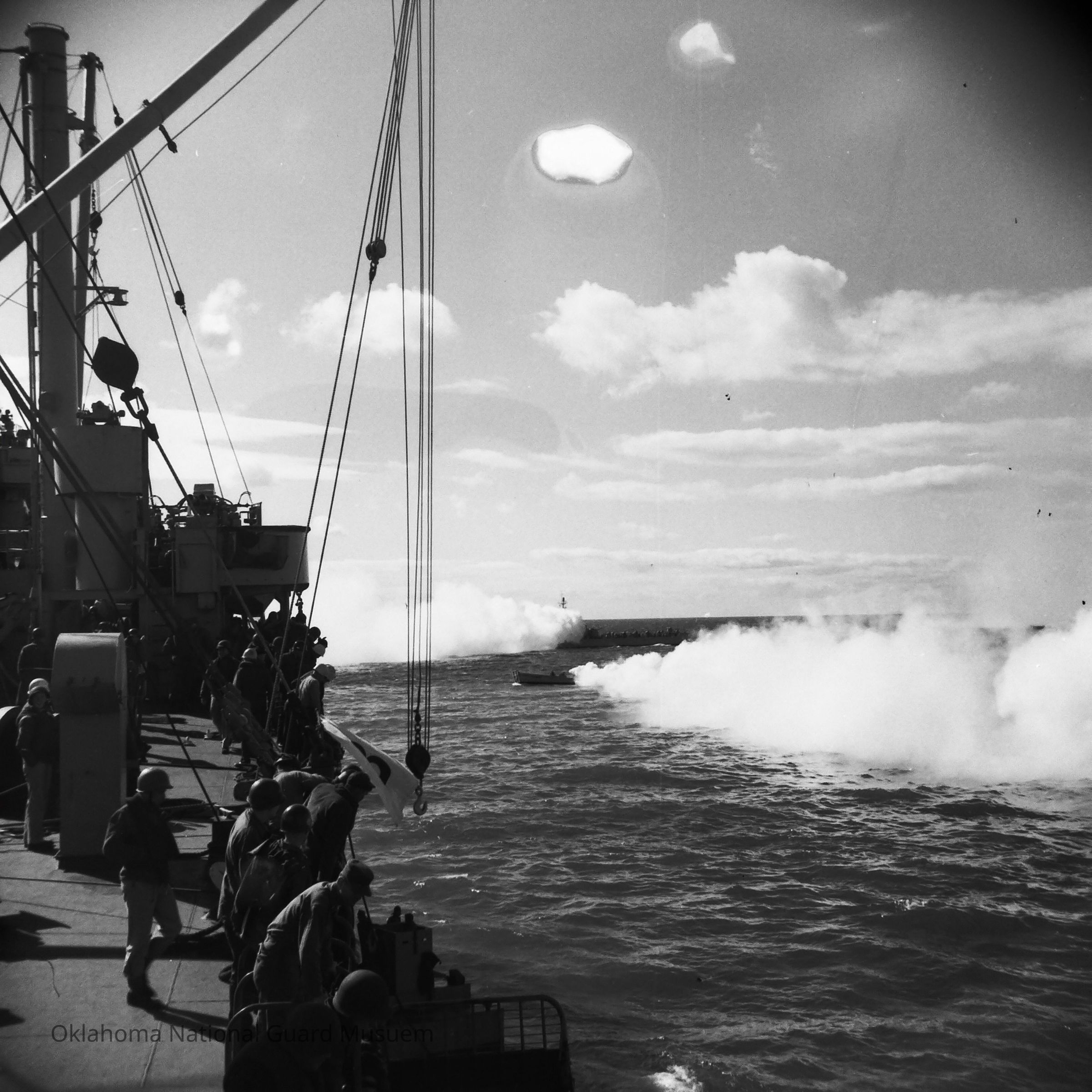 Negative of landing craft lay smokescreen at sea