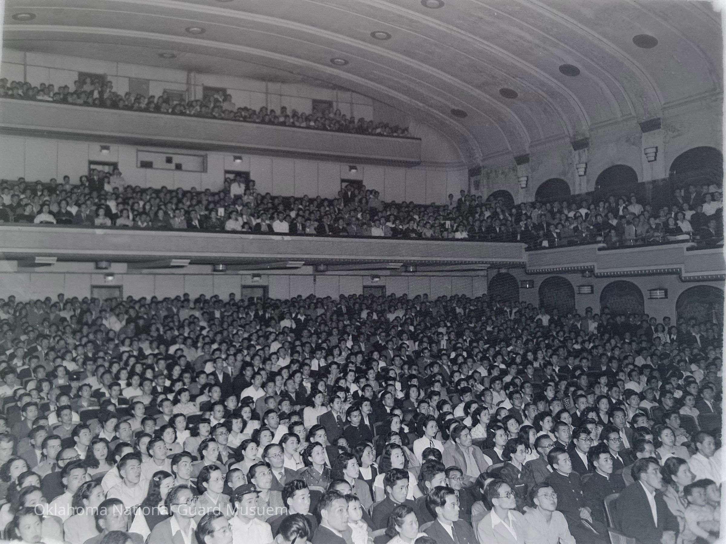 Negative of a large civilian audience in a theater on Hokkaido, Japan