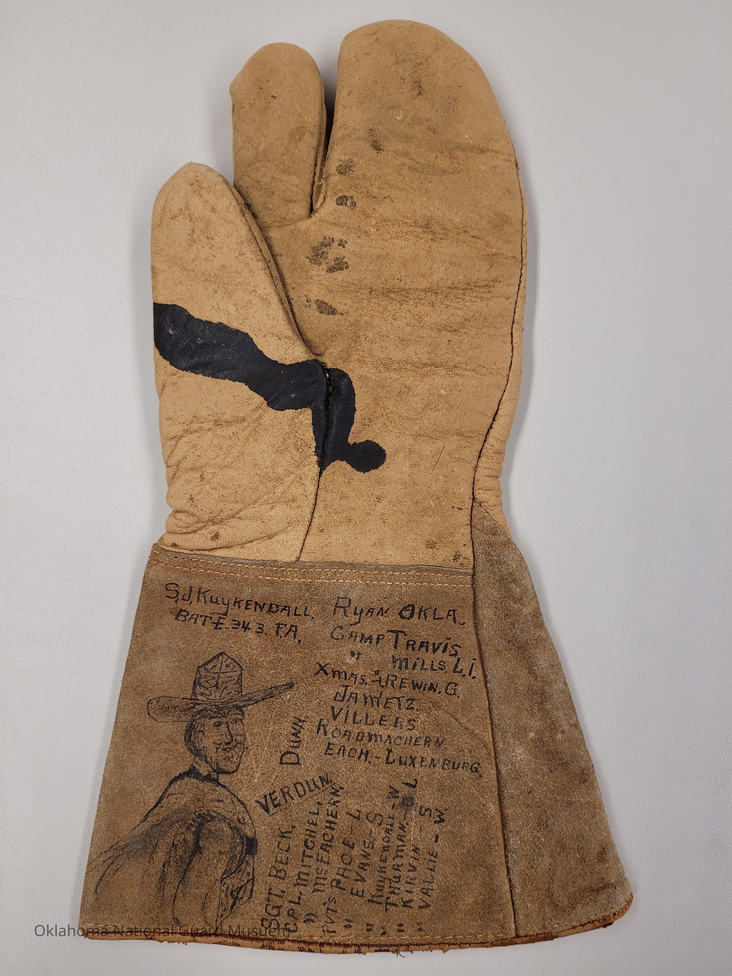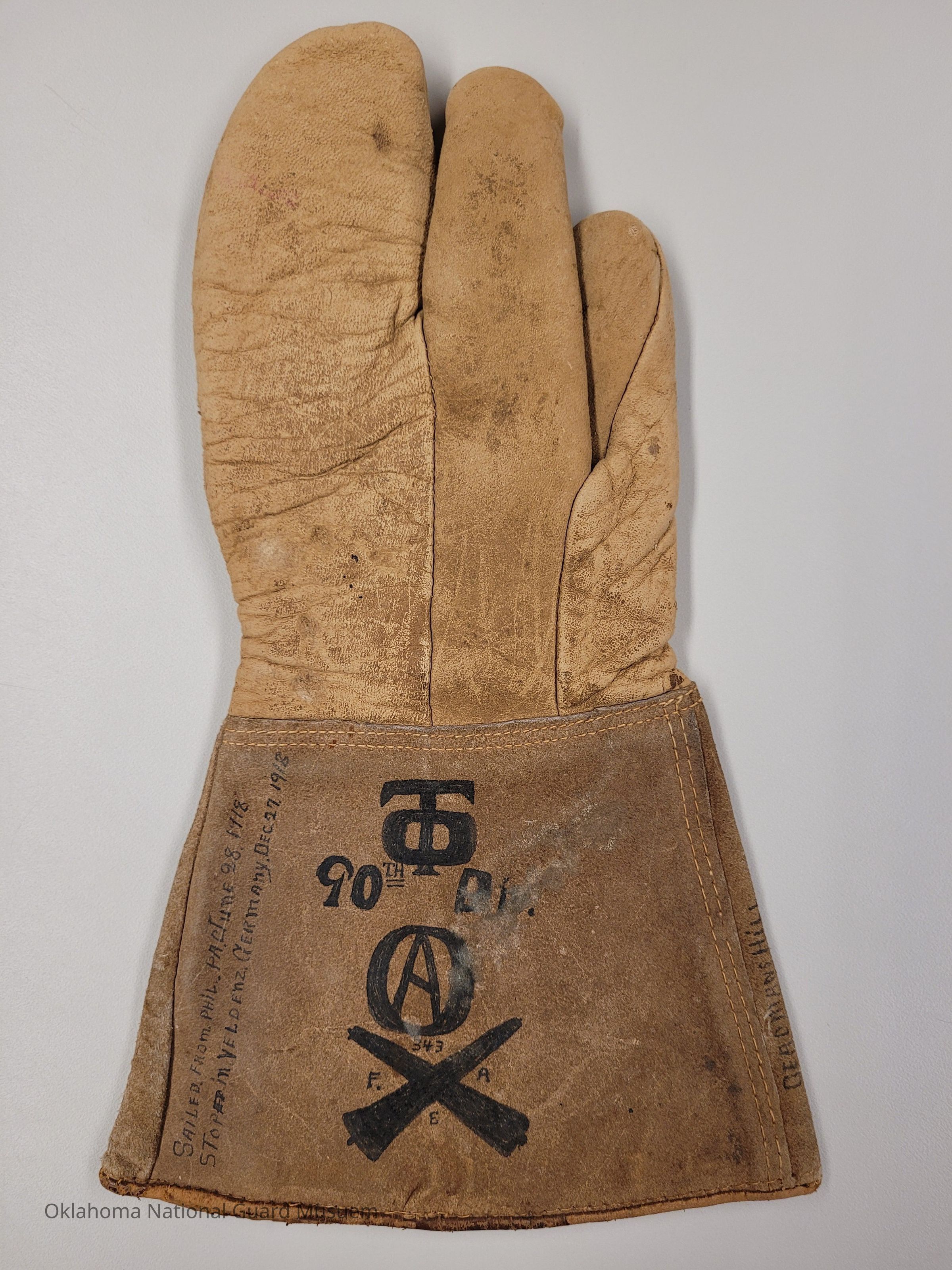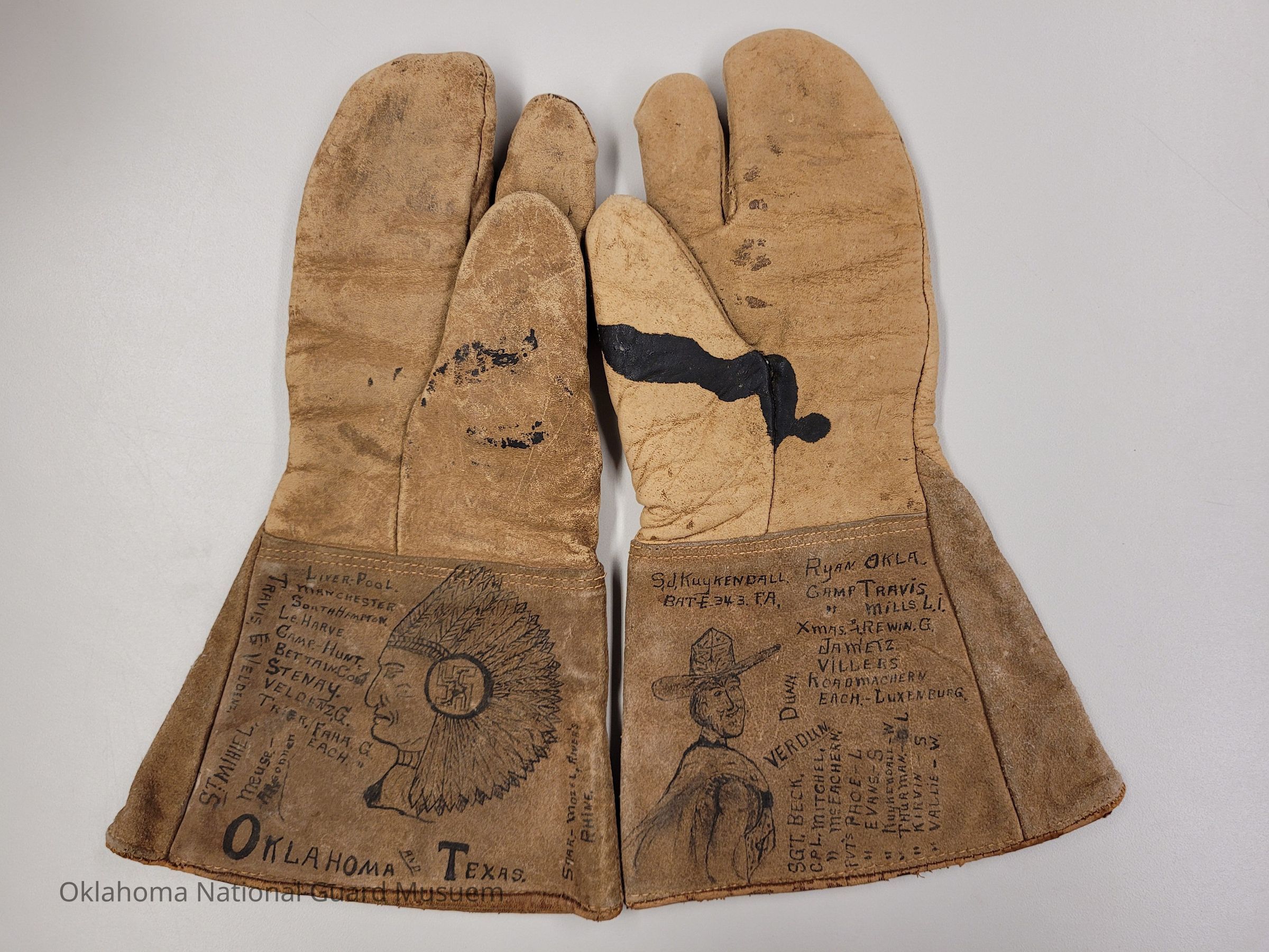Leather gauntlets with Indian head drawing and names. 90th Division 343rd Field Artillery Battery E