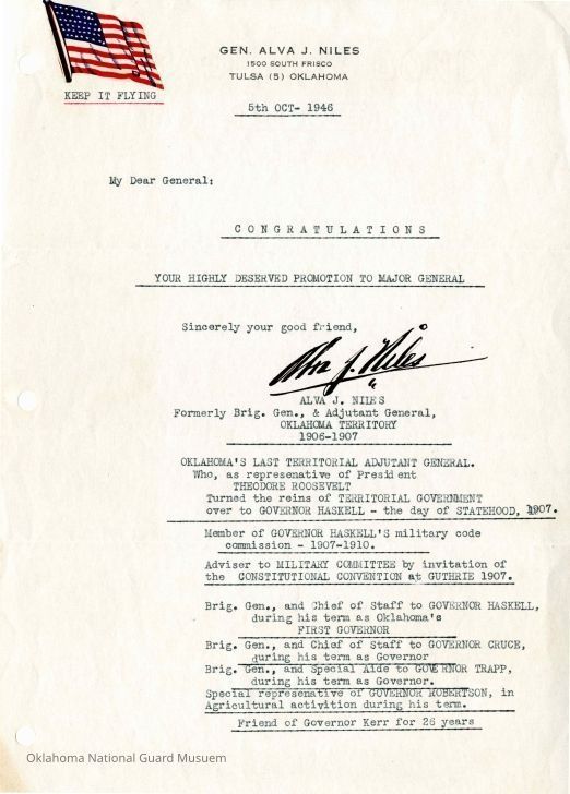 Letter of congratulations from Alva Niles to George Davis on his promotion to Major General