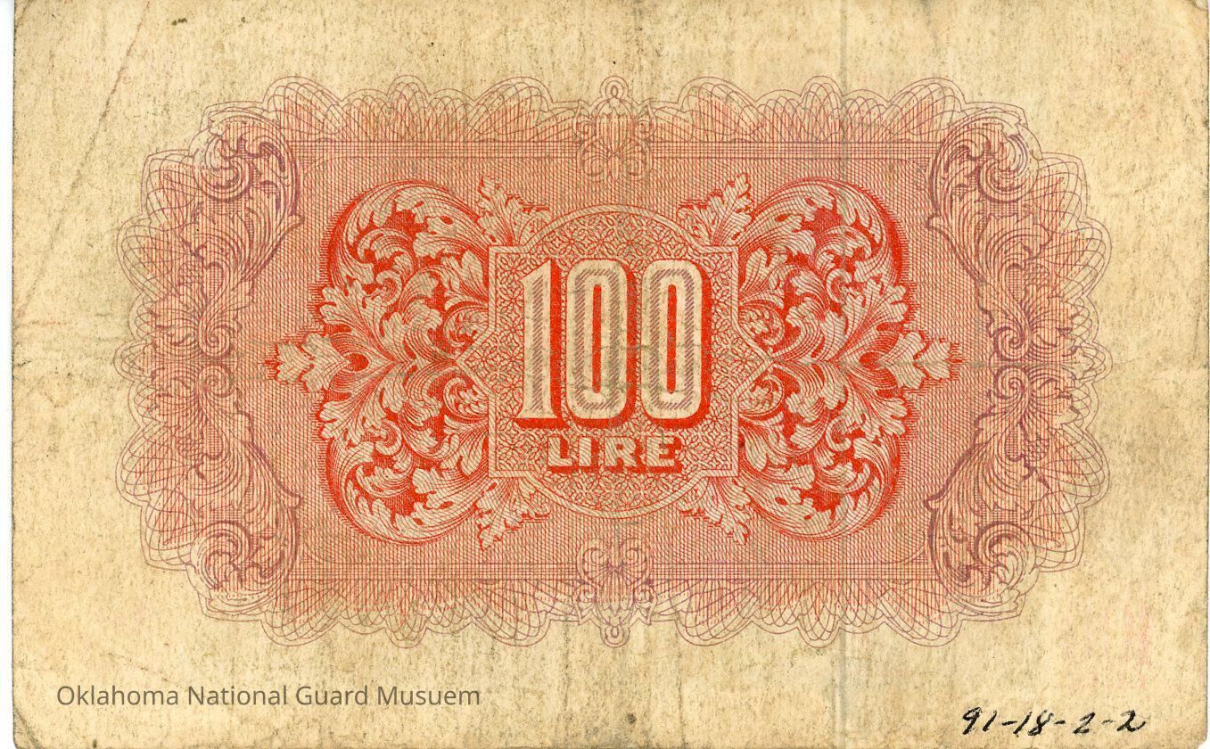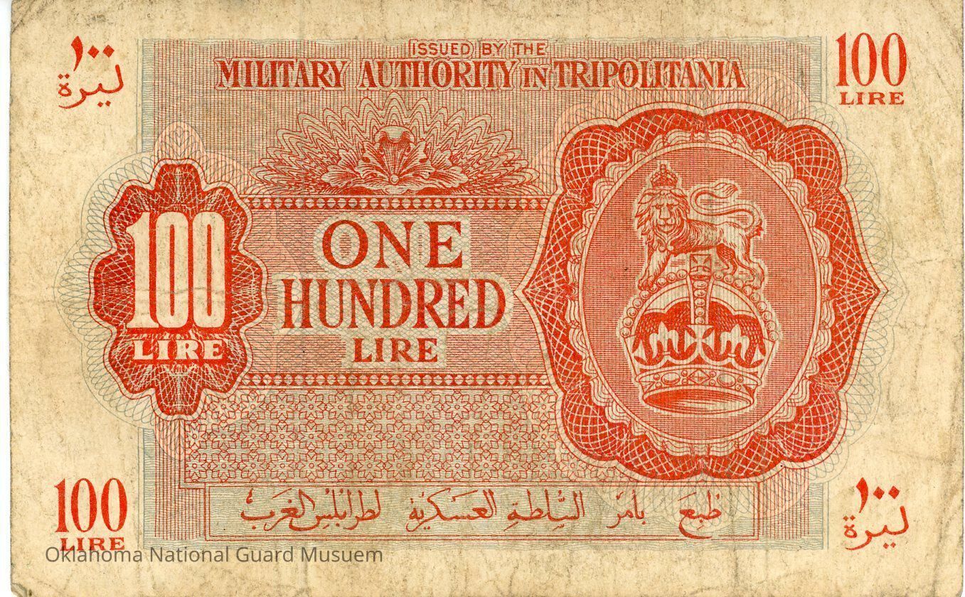 Libyan (Tripolitania) One Hundred Lire-1943. Accession number written on reverse in lower right cornerContext