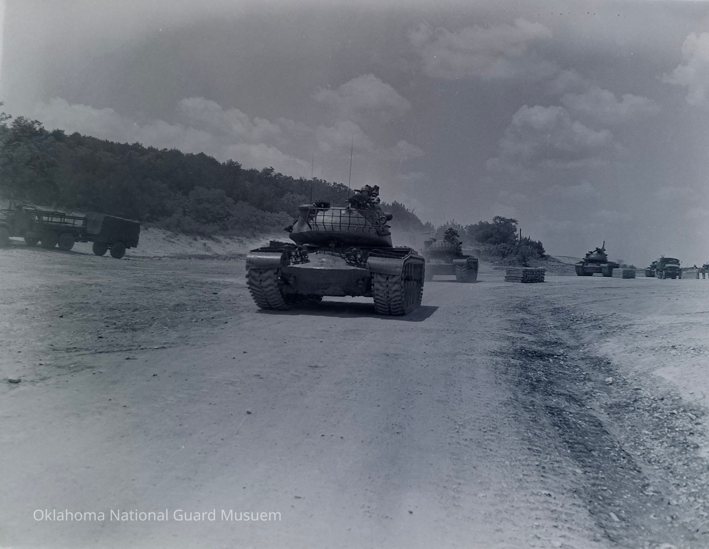 Negative of a line of tanks underway at a training ground. 245th Tank Battalion