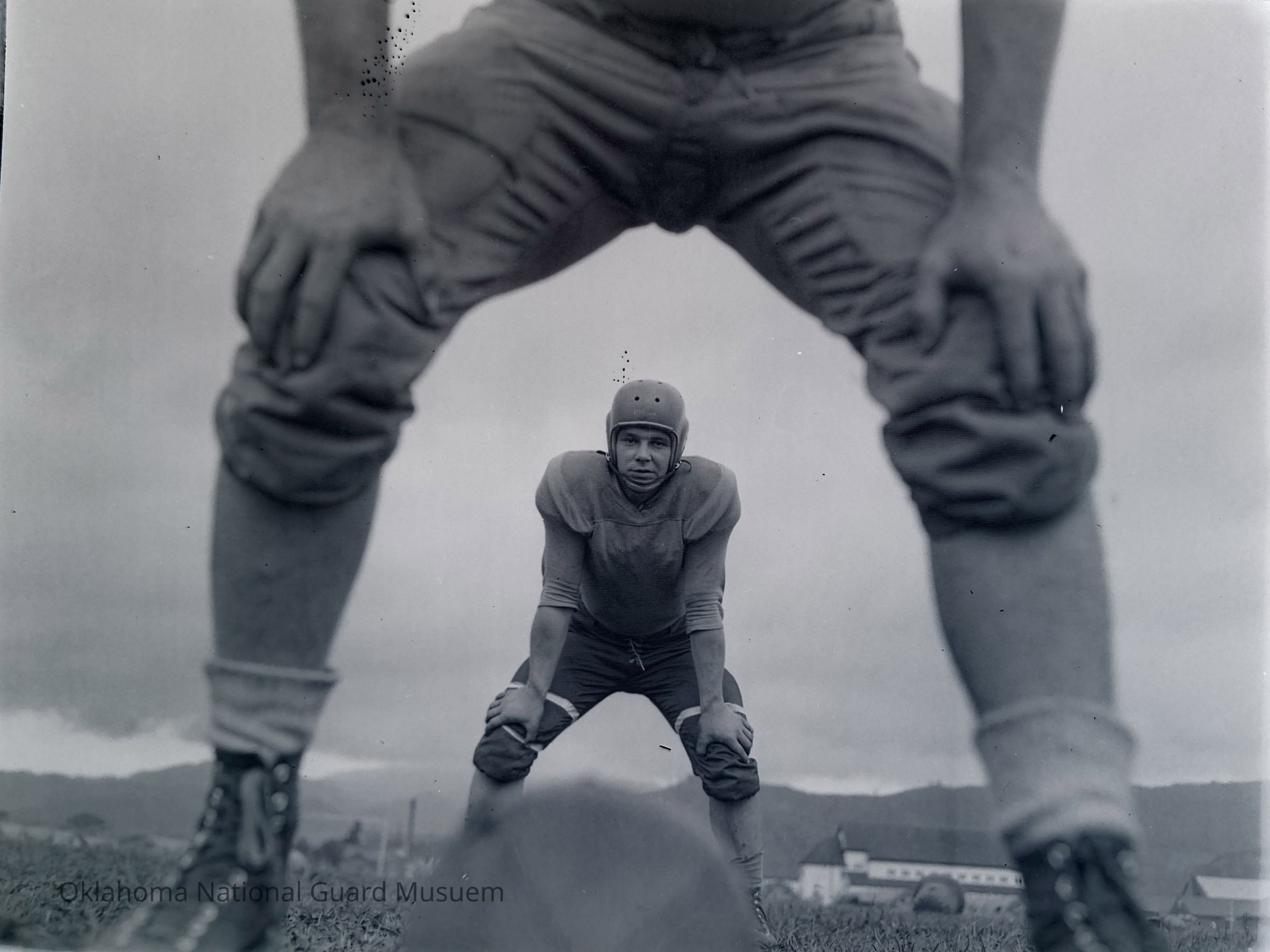 Looking between the legs of a football center