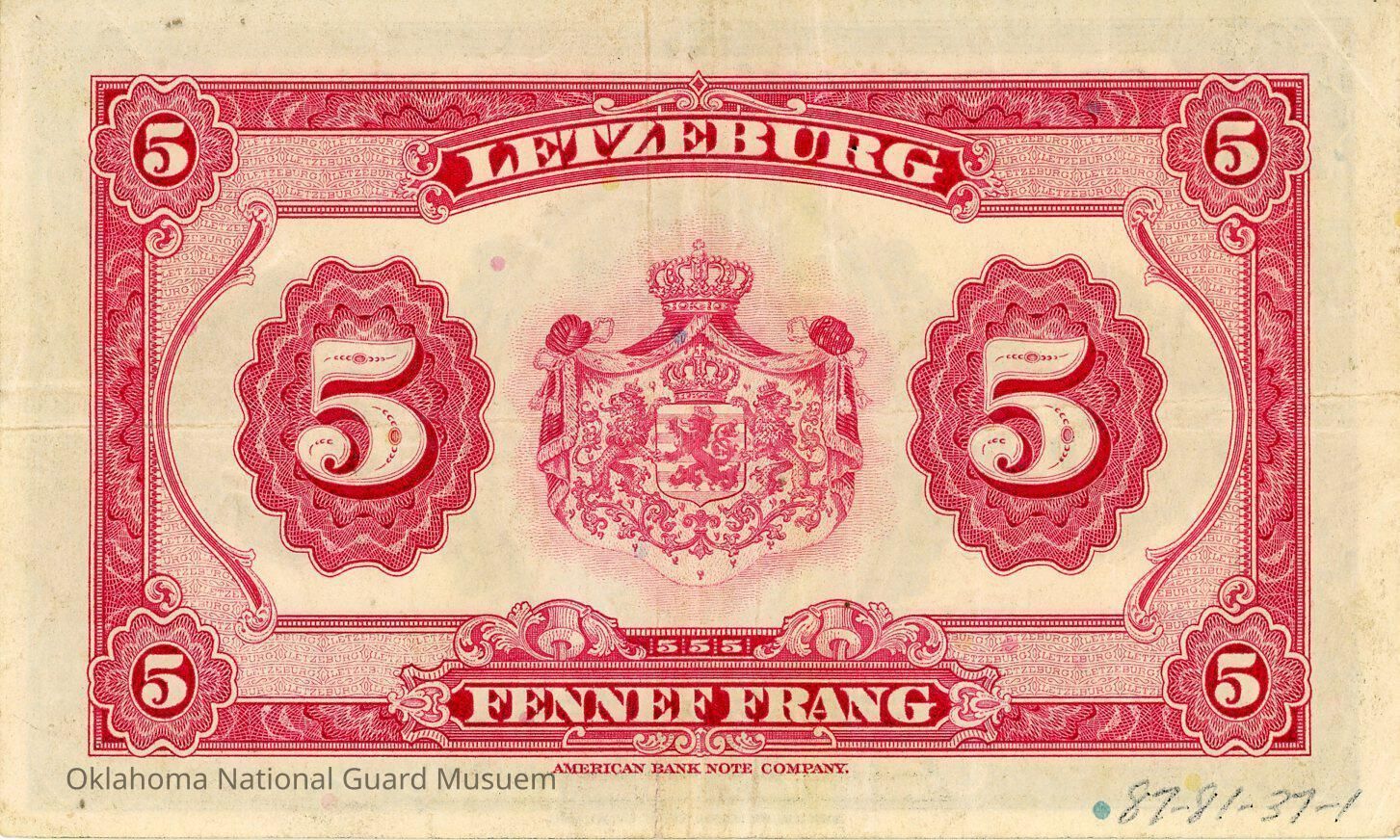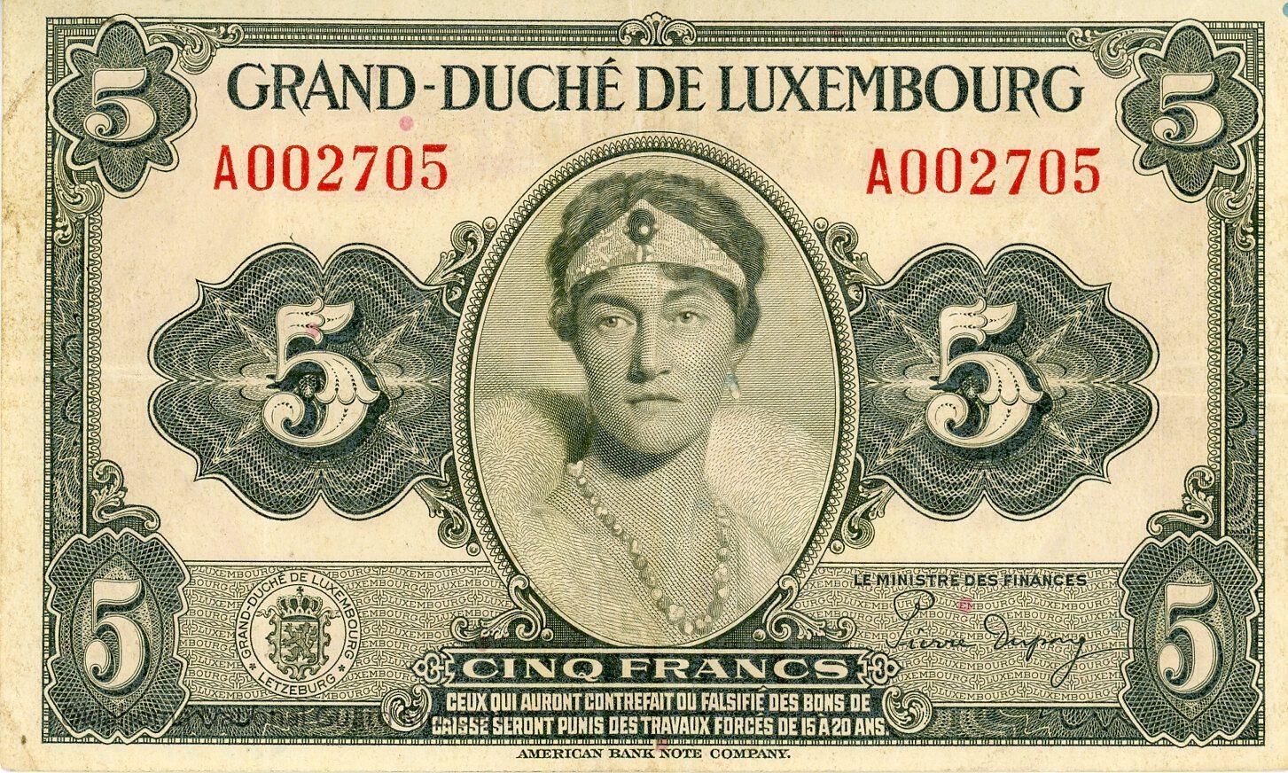 GRAND-DUCHY OF LUXEMBOURG 5 FRANCS THOSE WHO HAVE COUNTERFEITED OR FALSIFIED VOUCHERS WILL BE PUNISHED WITH HARD LABOR FOR 15 TO 20 YEARS.