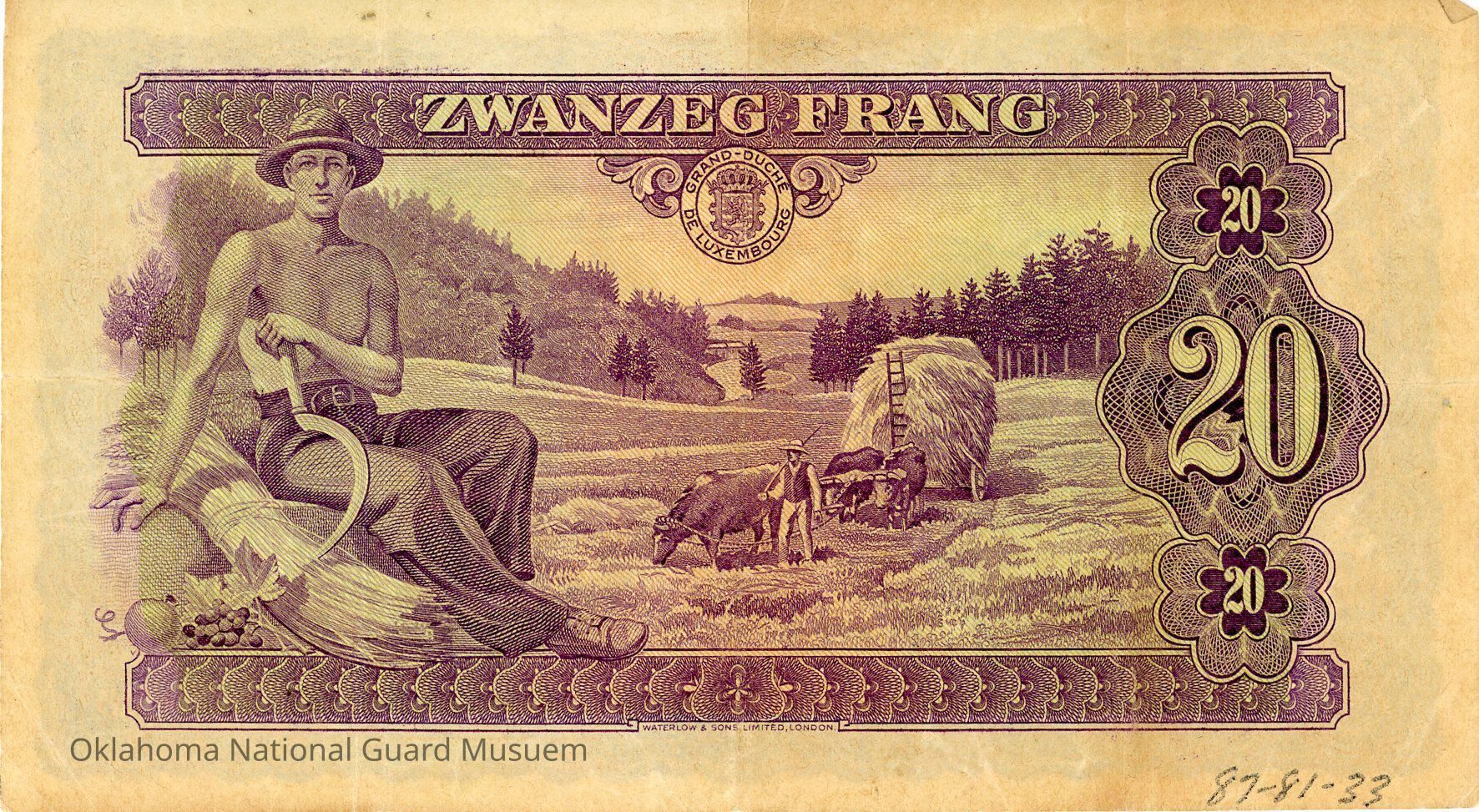 Luxembourg Twenty Francs-1943. Accession number written on reverse in bottom right corner