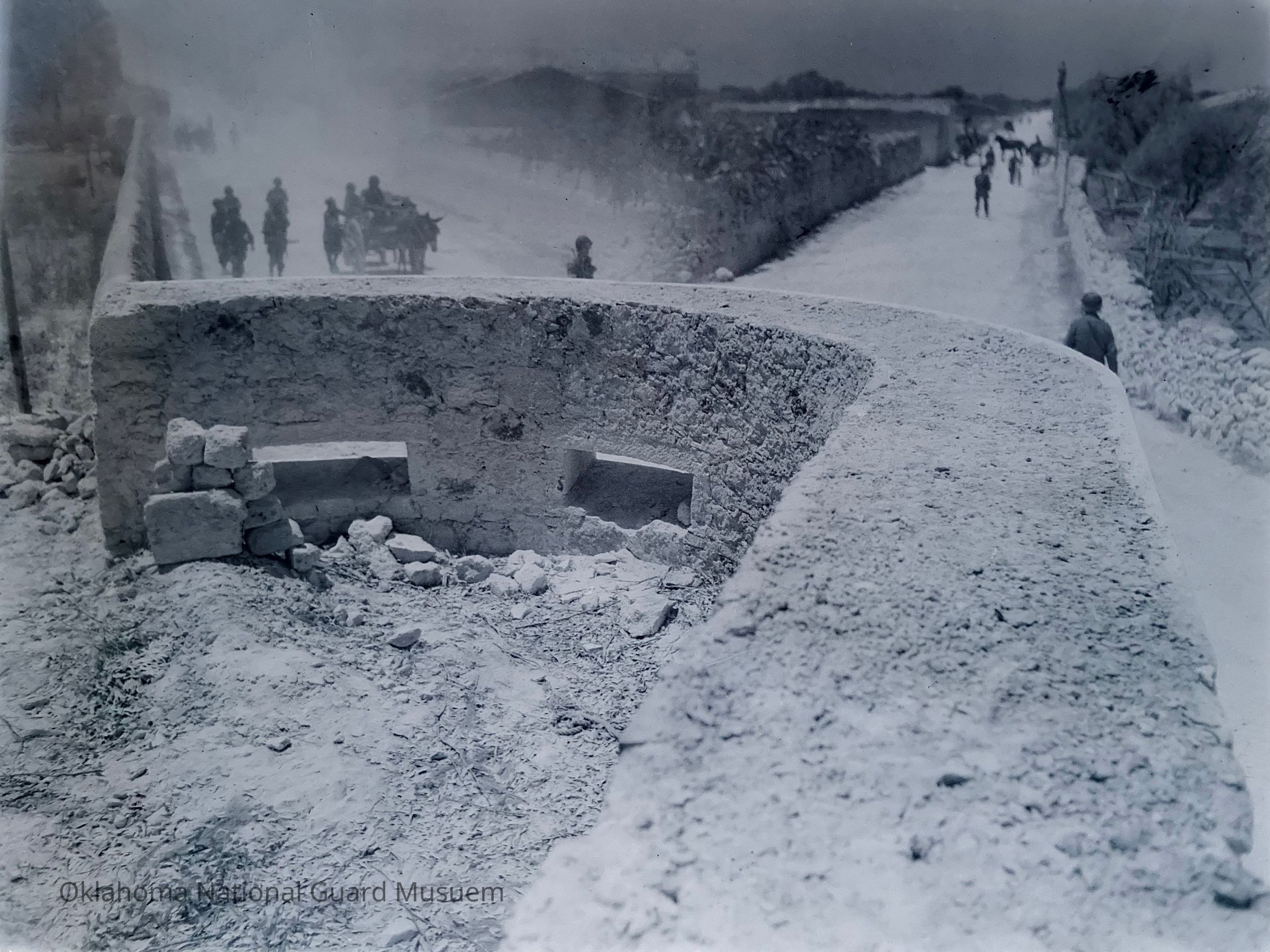 Negative of a machine gun nest at fork in the road in Sicily. Left fork goes to Santa Croce Camerina and the right fork heads to Scogletti. The soldiers on the road are men of the 82nd Airborne headed to the front.