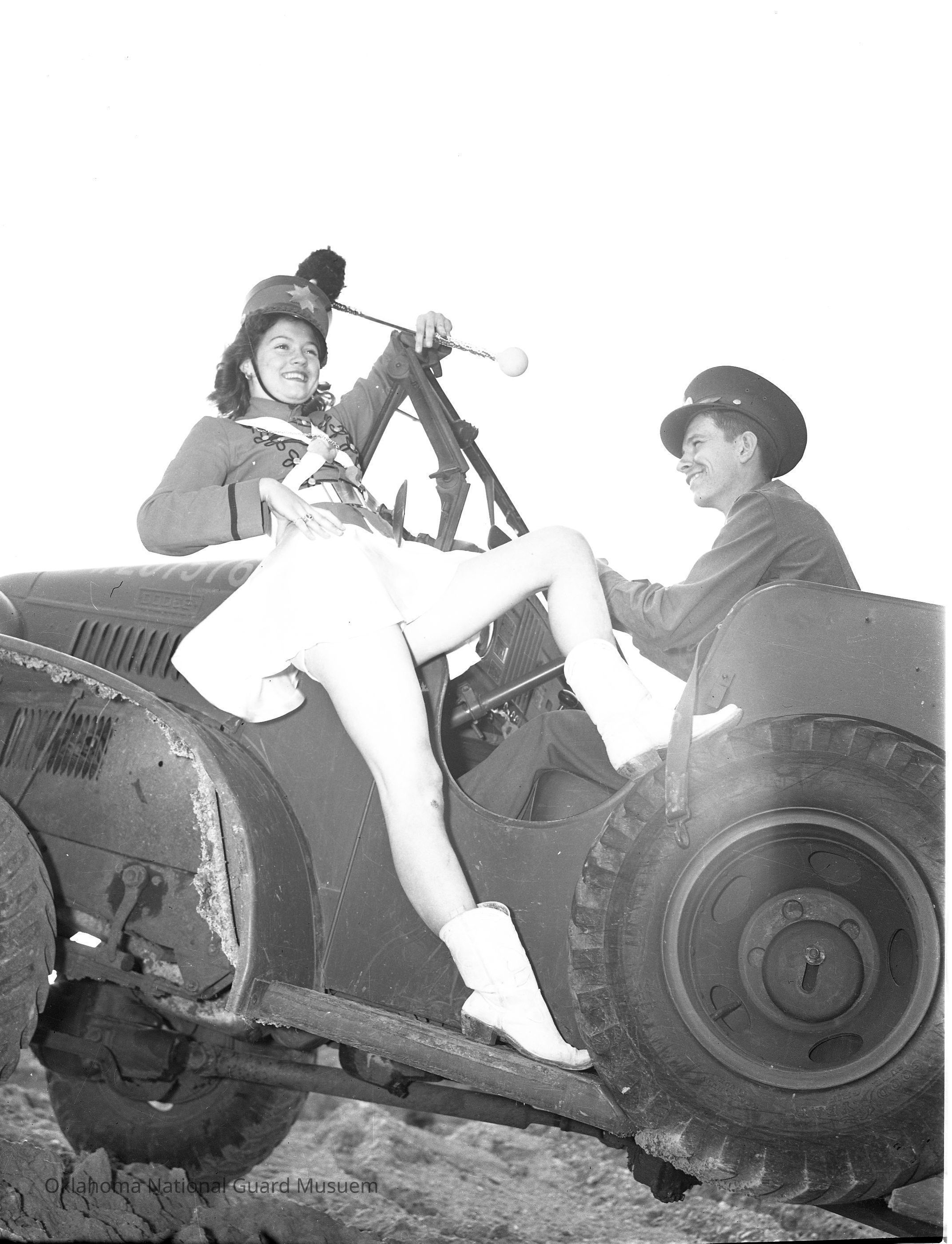 Negative of a majorette posing on the side of a command car