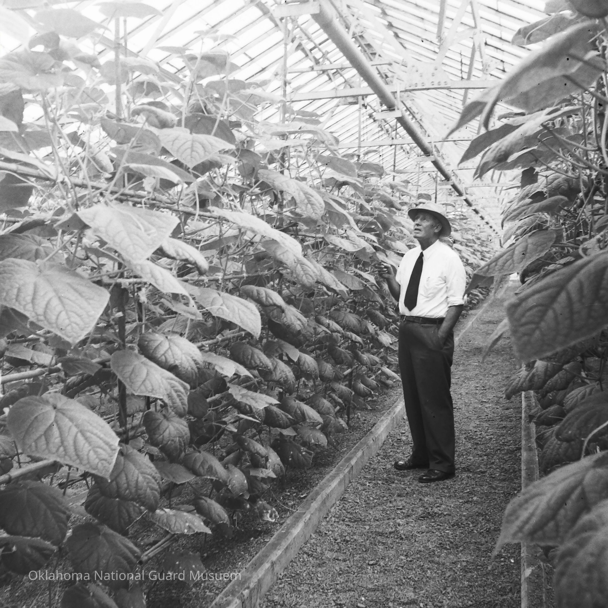 Negative of a man examining plants in a greenhouse