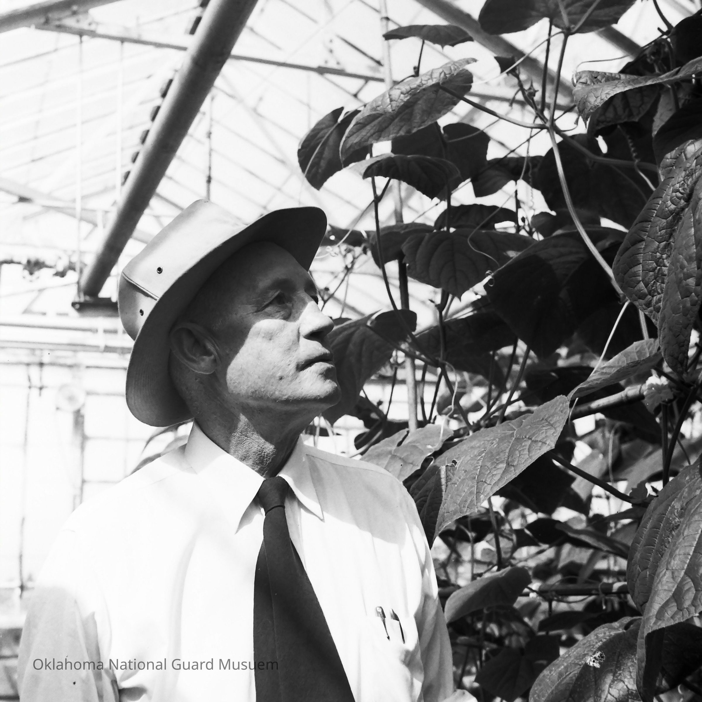 Negative of a man inspecting plants in greenhouse