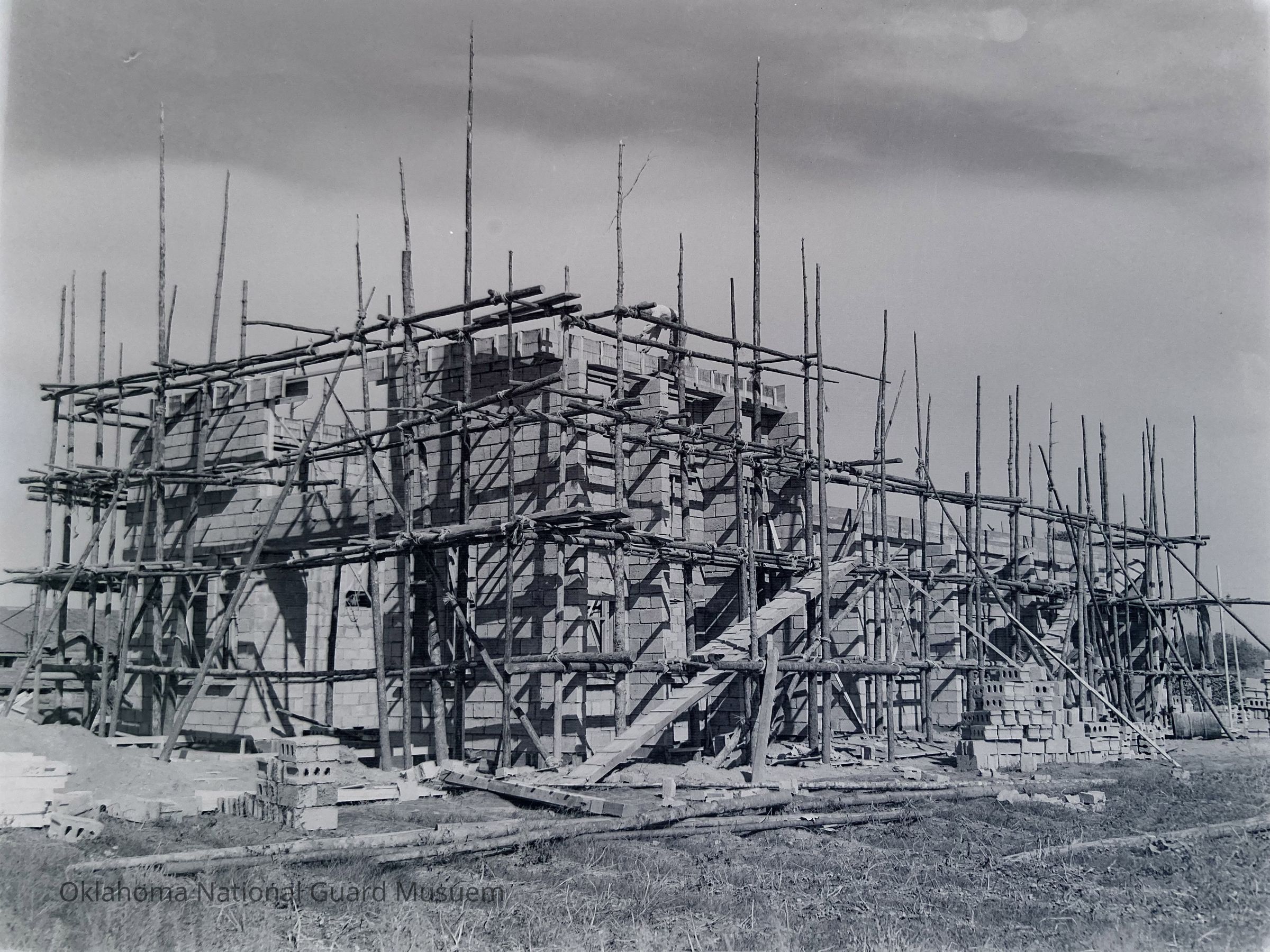 Negative of a masonry building under construction using timber scaffolding on Hokkaido, Japan