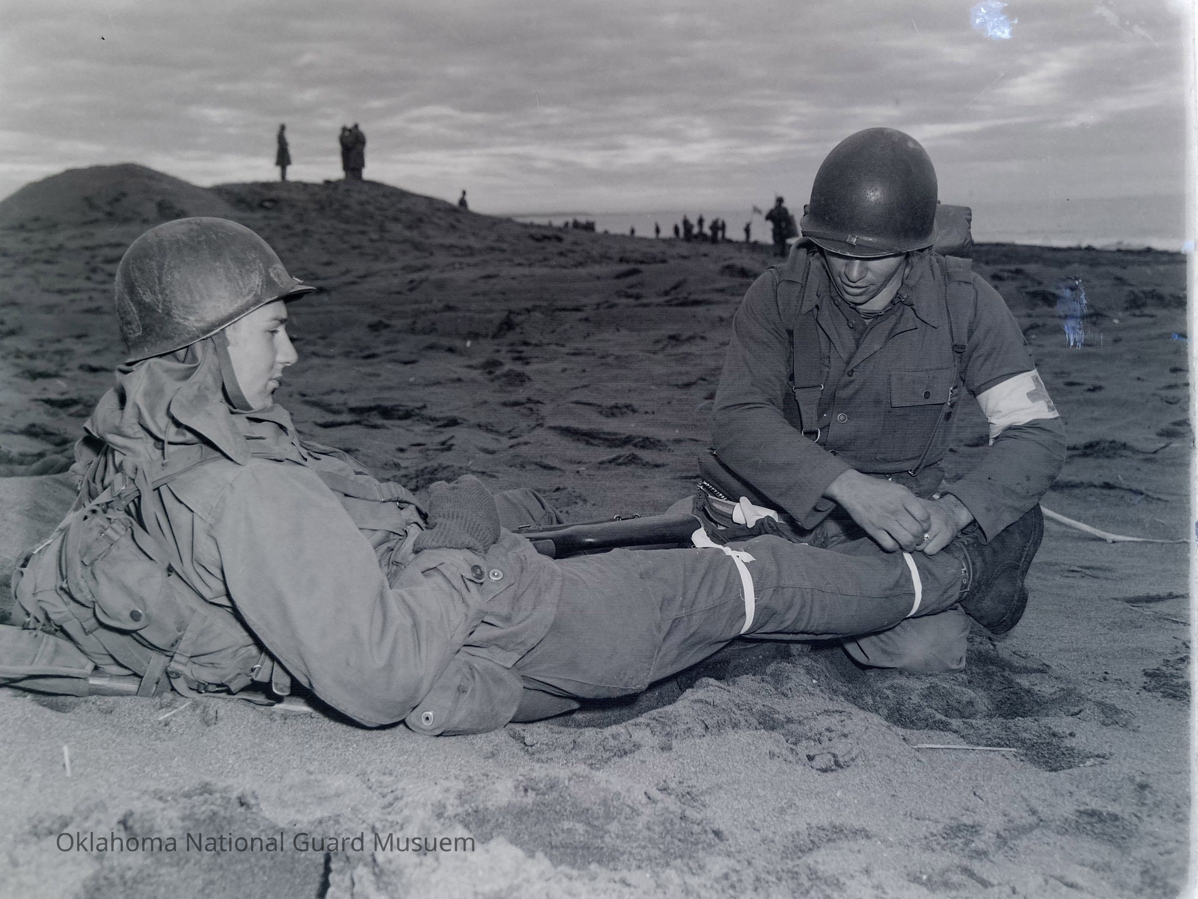 Negative of a medic splinting a soldier's leg on a beach during war games on Hokkaido, Japan.