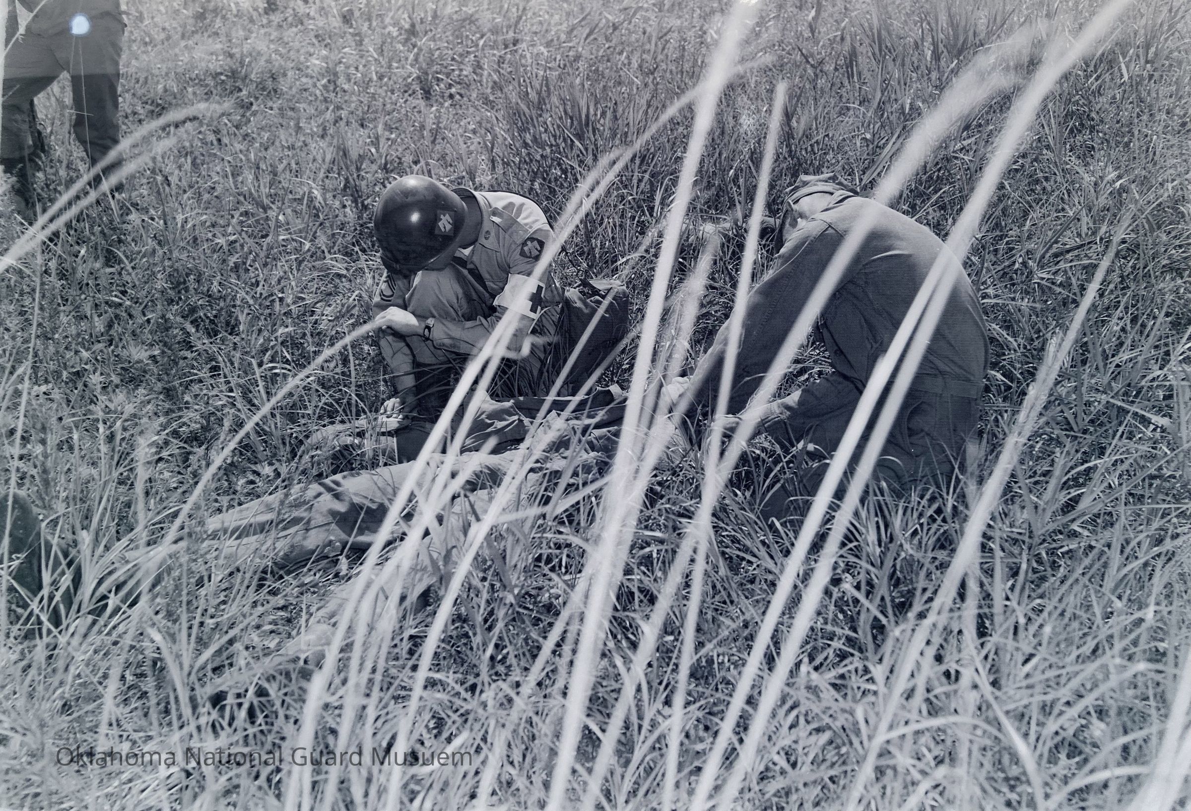 Negative of medics working a wounded man during war games on Hokkaido, Japan.