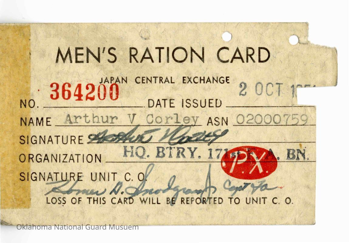 Men's Ration Card for Arthur V. Corley, Headquarters Battery 171st Field Artillery to be used at the Japan Central Exchange