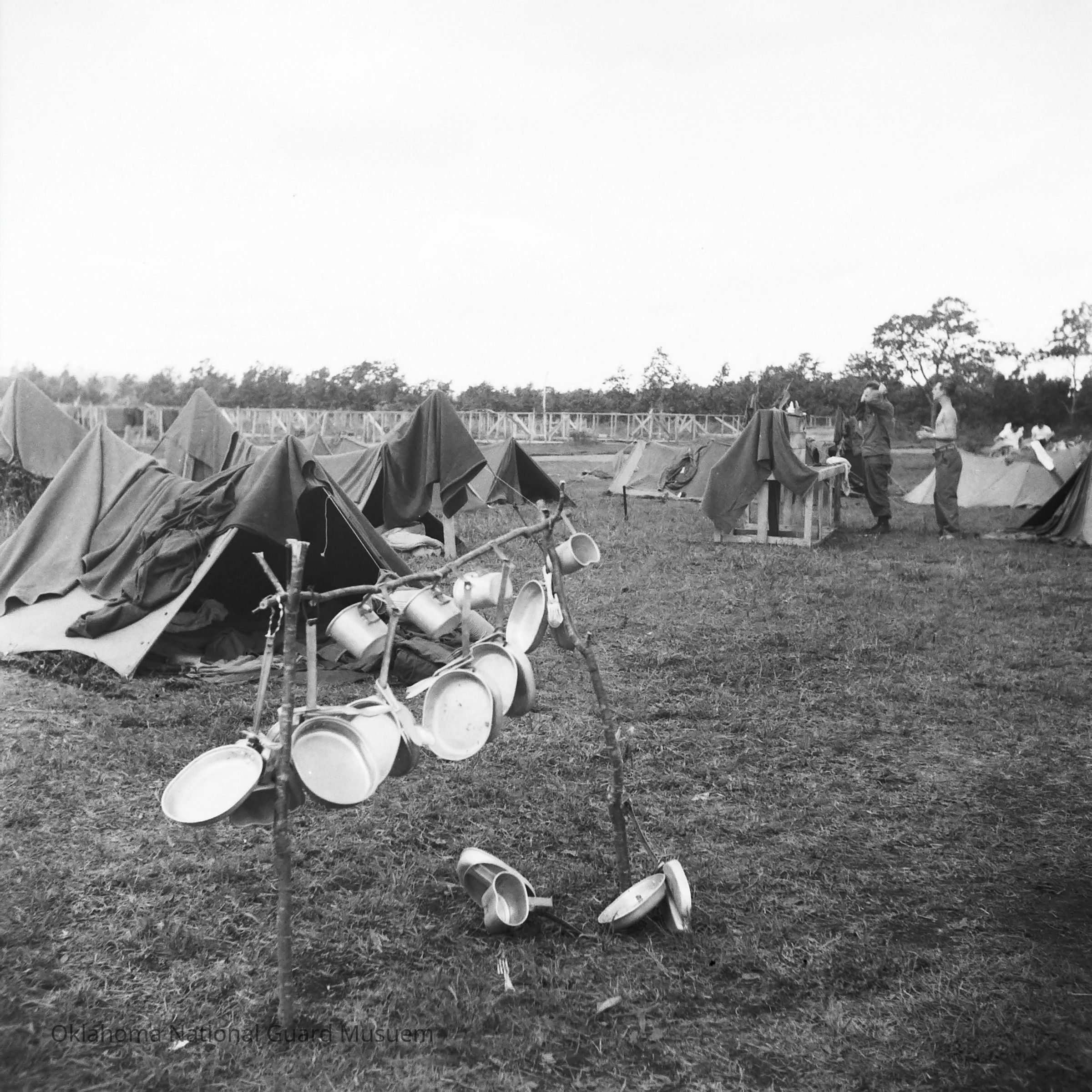 Negative of mess gear hanging out to dry with tent camp in background