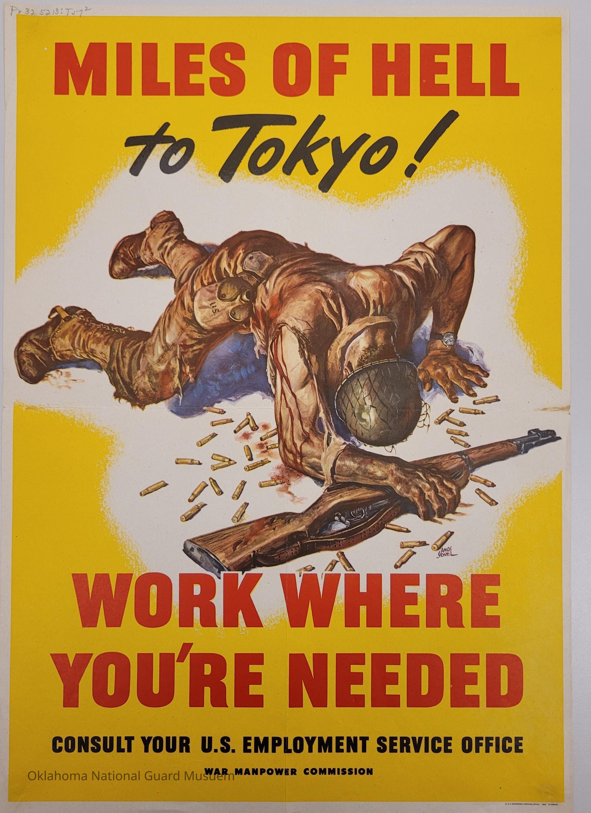 Wounded soldier crawling with rifle and bullets. U.S. Employment Service Office posterCollection