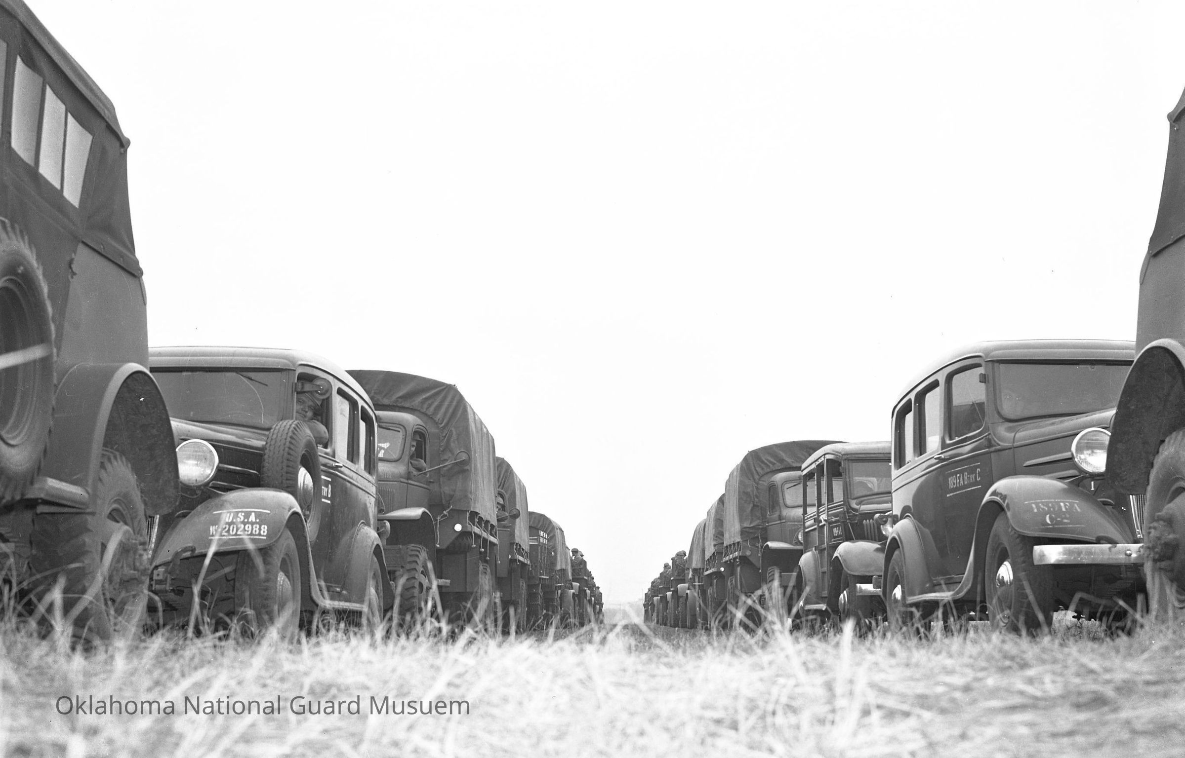 Negative of military cars and trucks lined up. 189th Field Artillery