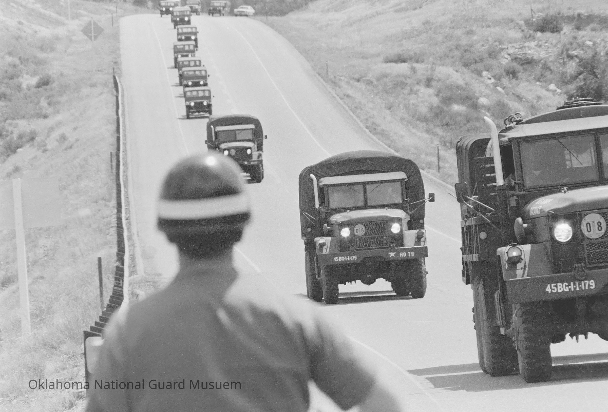 Negative of Military Police watches as convoy from the 179th Infantry drives down highway to Camp Red Devil for training