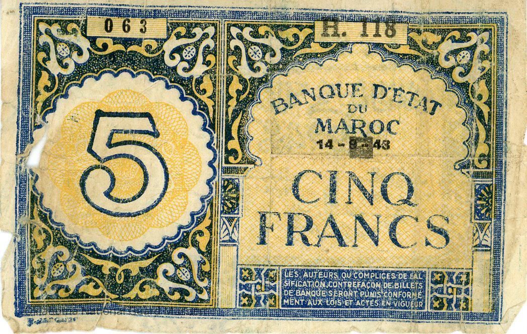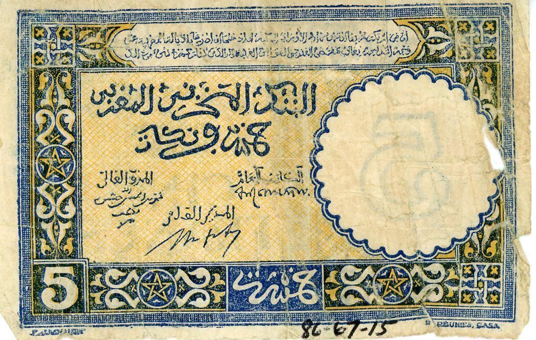 Composition with arabesque ornamentation opening on a portal on the right. The value in figures is inscribed in a circular medallion on the left. The value in letters and the mention "State Bank of Morocco" are printed in dark blue. The numbering, the alphabet and the date of issue (the month of which is hidden by a black square) are printed in black. The law article is printed in a dark blue cartouche at the bottom.Transcription