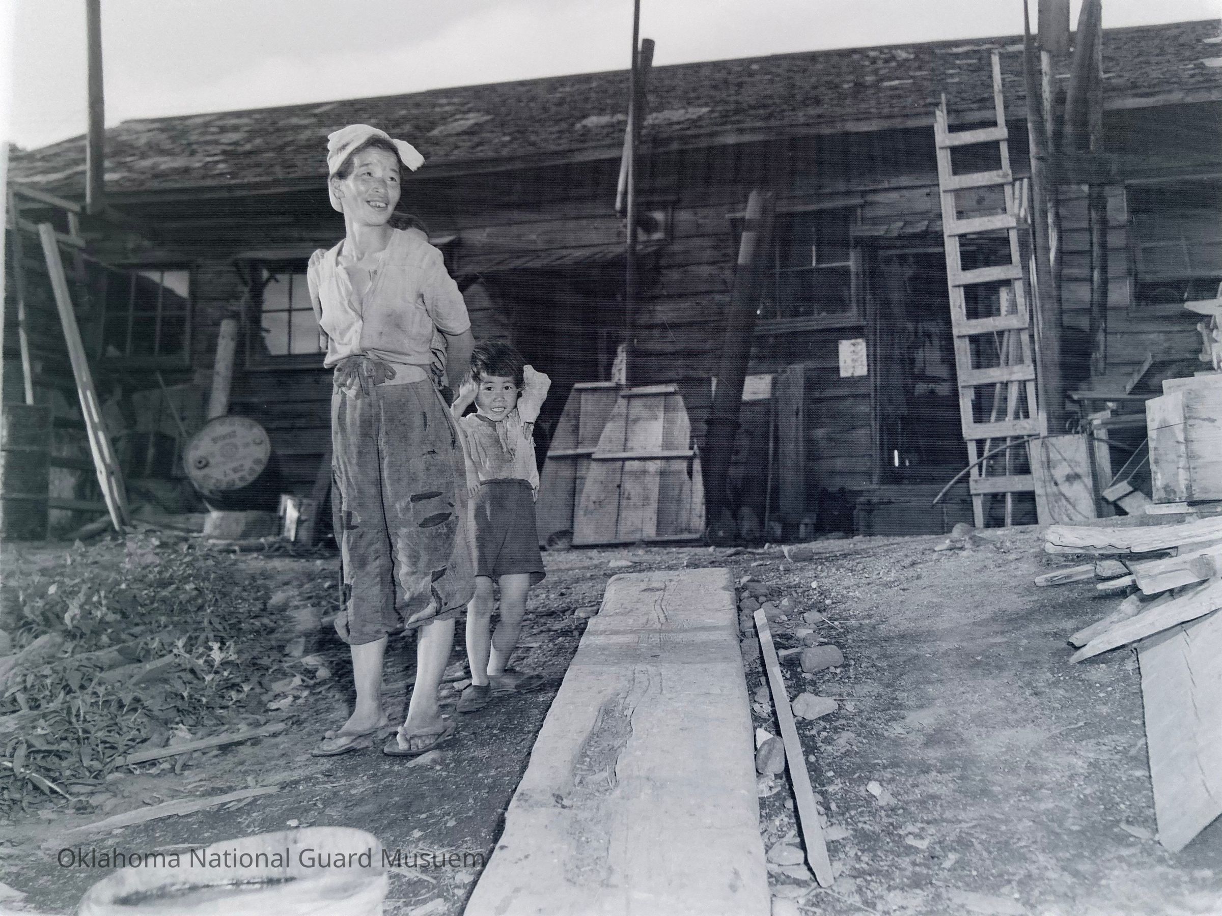 Mother and child in ragged clothing in front of a makeshift dwelling