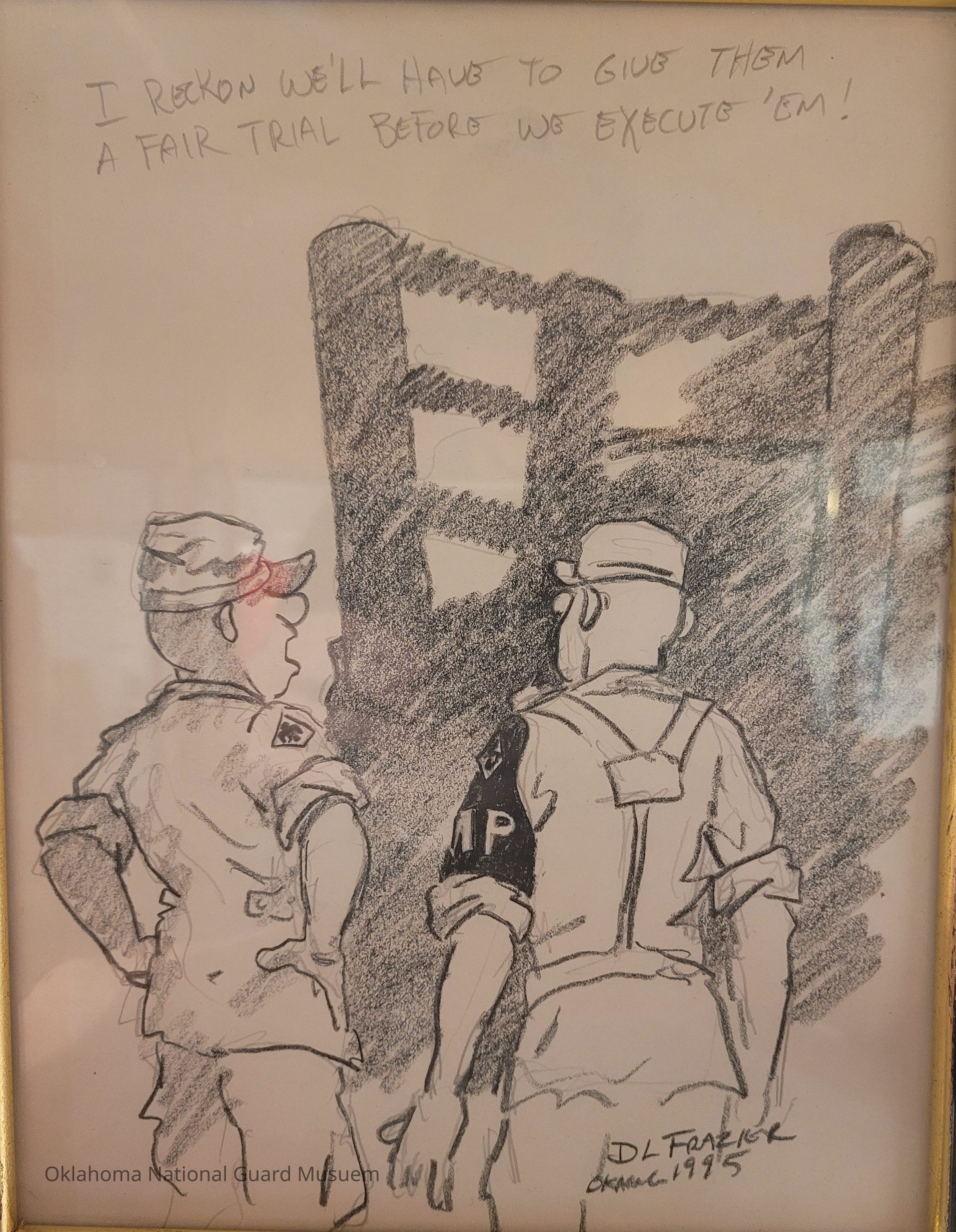 D.L. Frazier's drawing of two guardsmen looking at the destruction after the Oklahoma City bombing.