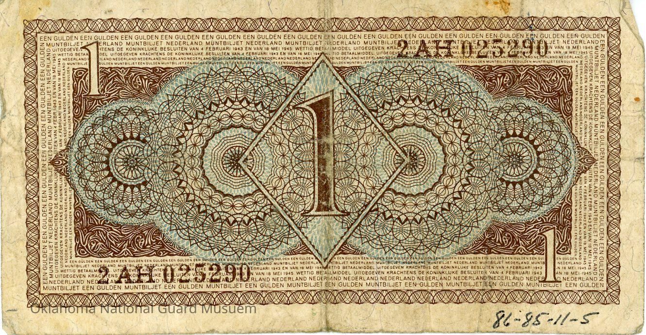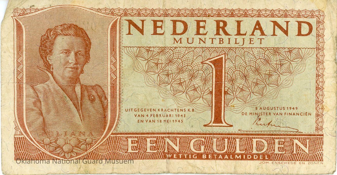 Brown frame with patterns and rosettes. Portrait of Queen Juliana at left. Value 1 in brown at center. Signature: Lieftinck. The signatures are printed in brown.Transcription