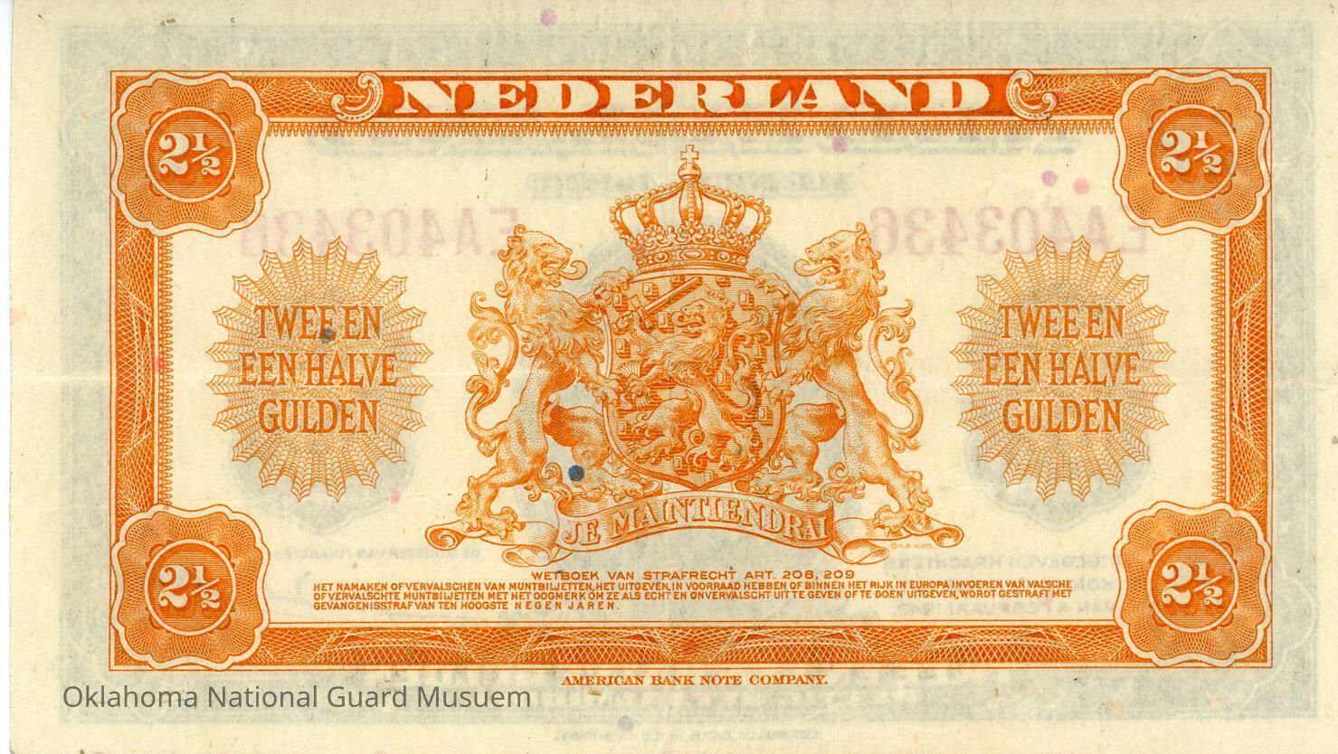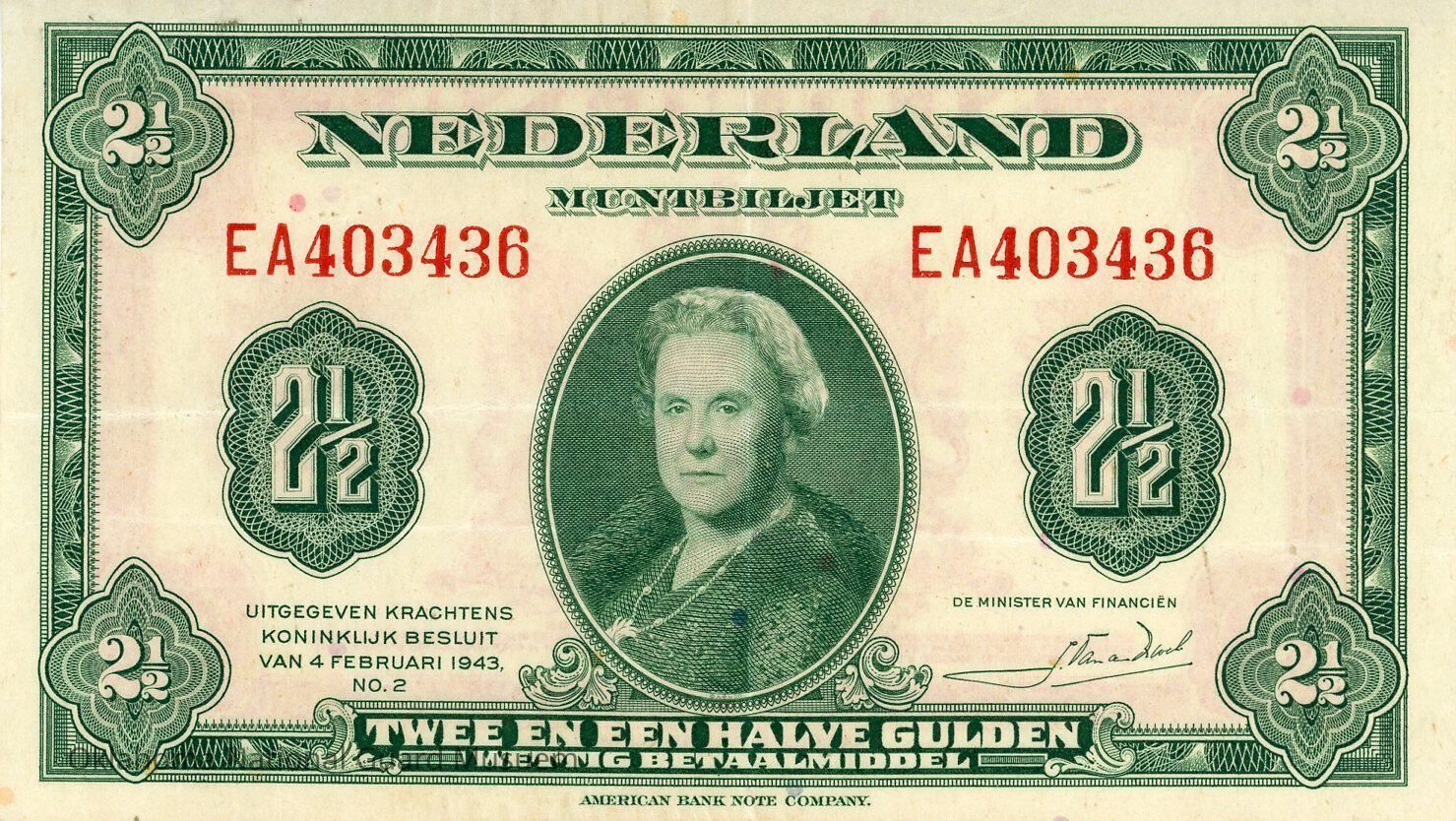 Orange and white note with the Dutch Coat of Arms in the middle.Transcription
