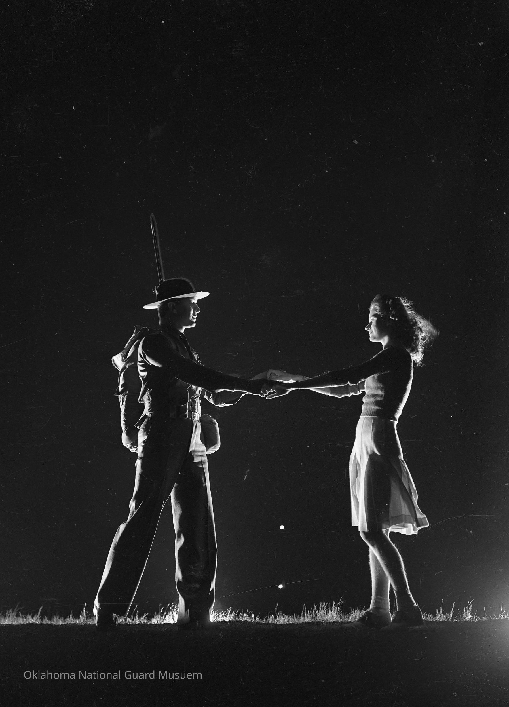 Negative of a night shot of a soldier and a girl