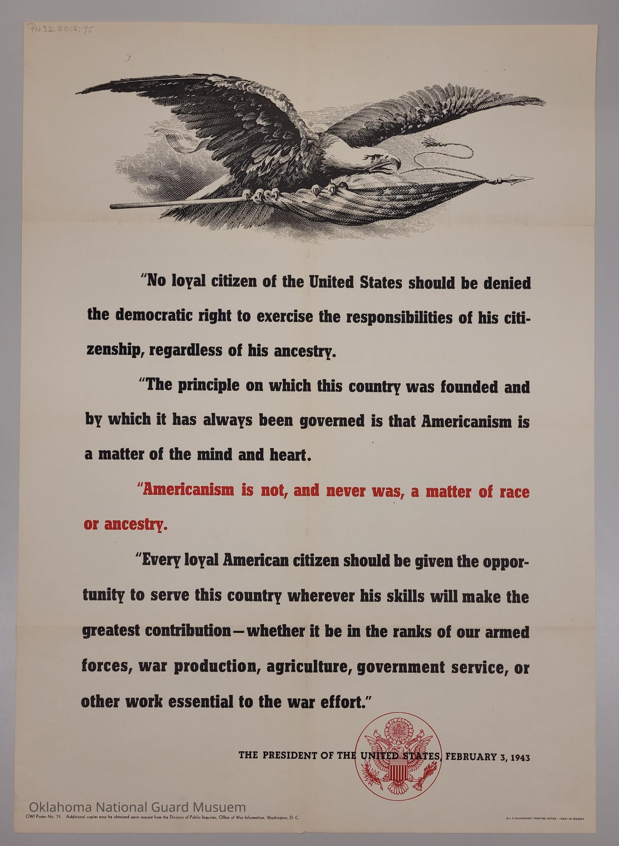 At the top of this poster about serving the country is an engraving of a bald eagle with its wings spread wide, grasping a staff bearing a partially rolled American flag in its talons. On a white background in black and red letters is a message from the President: “No loyal citizen of the United States should be denied the democratic right to exercise the responsibilities of his citizenship, regardless of his ancestry. “The principle on which this country was founded and by which it has always been governed is that Americanism is a matter of mind and heart. “Americanism is not, and never was, a matter of race or ancestry. “Every loyal American citizen should be given the opportunity to serve this country wherever his skills will make the greatest contribution- whether it be in the ranks of our armed forces, war production, agriculture, government service, or other work essential to the war effort. The President of the United States February 3, 1943 - superimposed over a red line drawing of the Presidential SealCollection