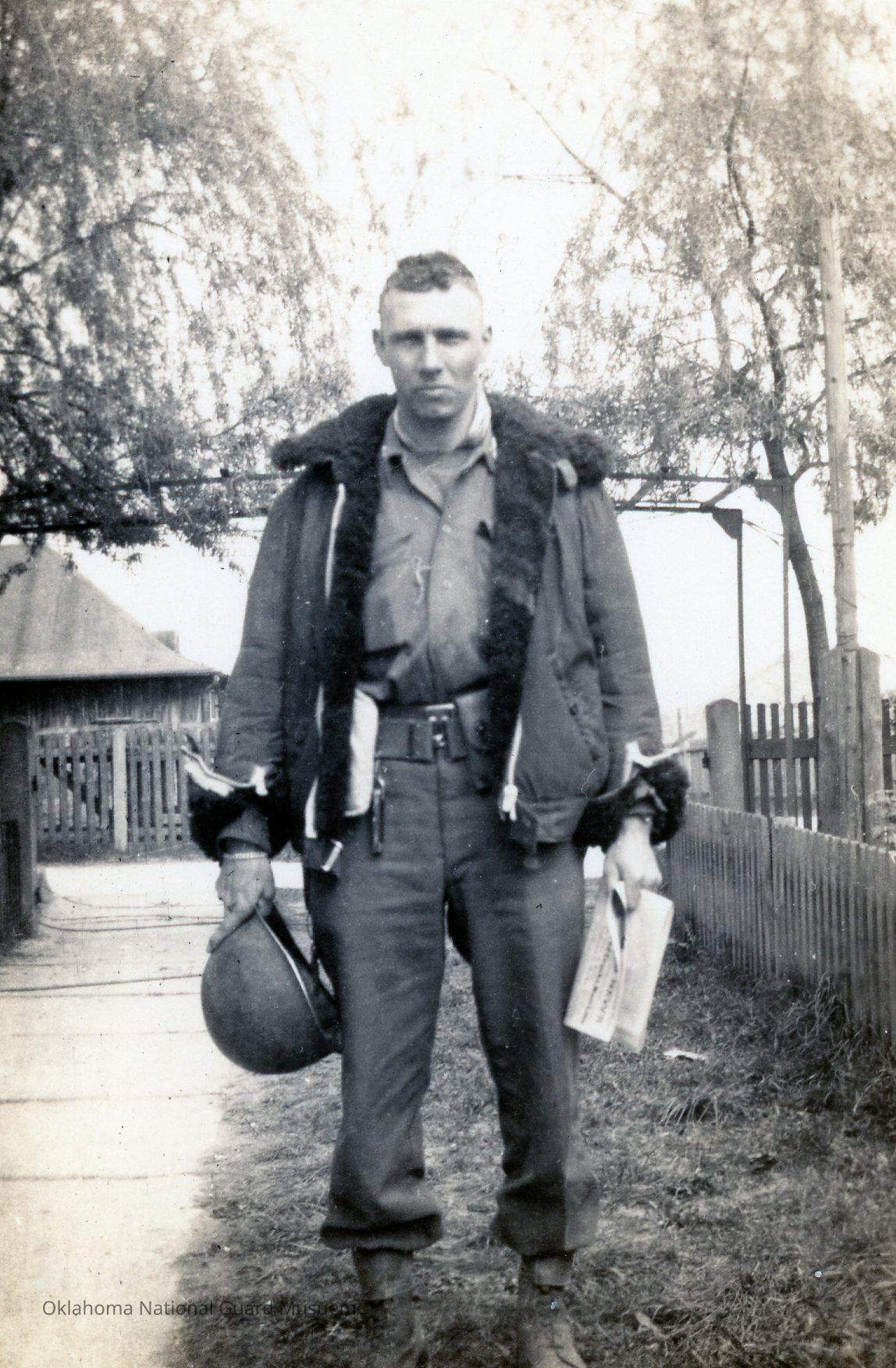 Dewey Bryan holding his helmet and newspaper Battery C 160th Field Artillery