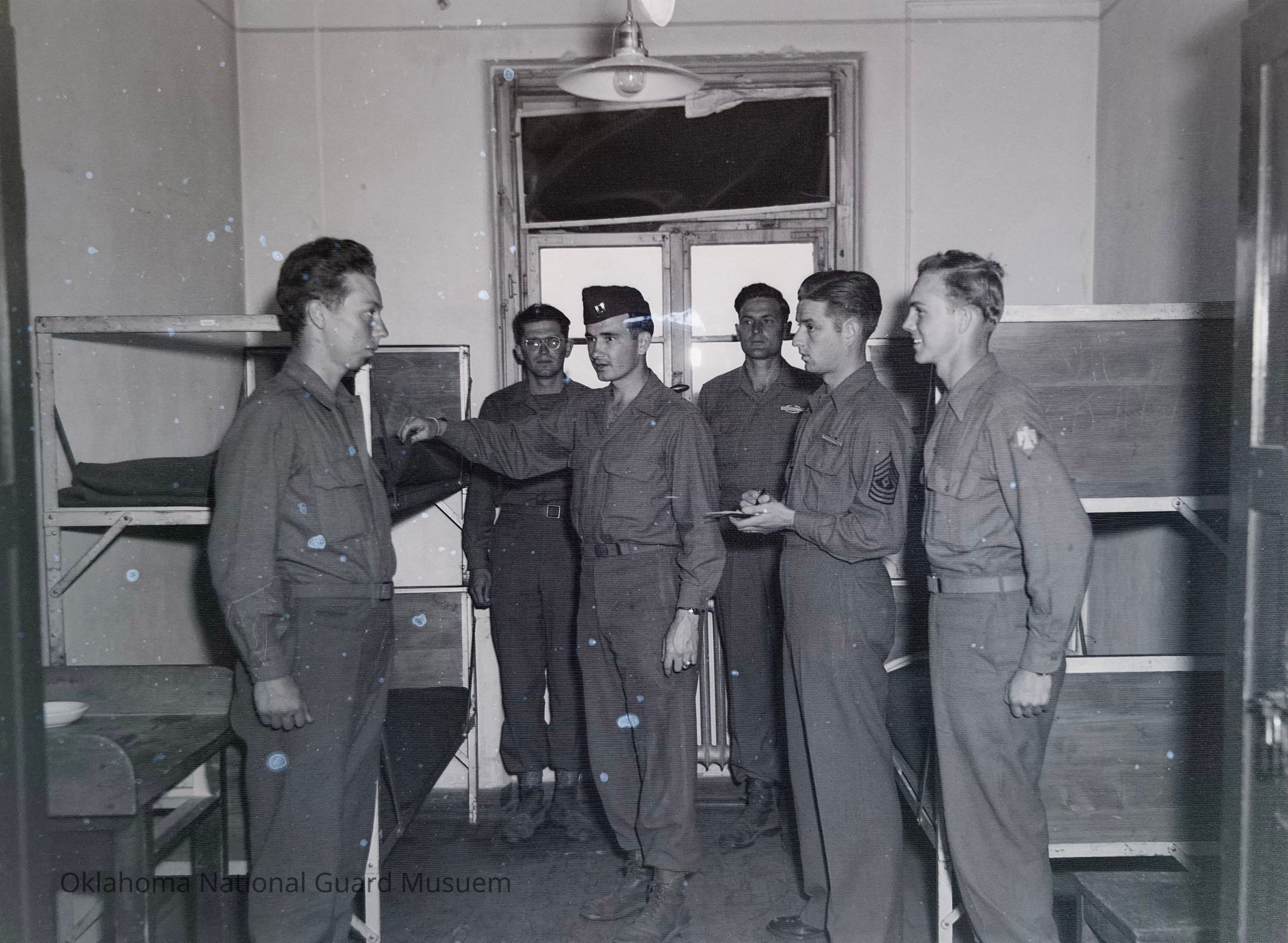 Negative of Captain Sanders inspecting bunks. 157th Infantry