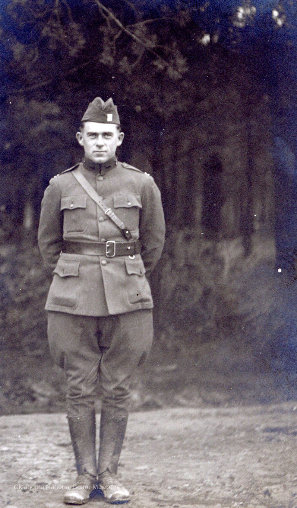 Tom McMurry, 111th Ammunition Train 36th Infantry Division, standing for a photo in front of the woods