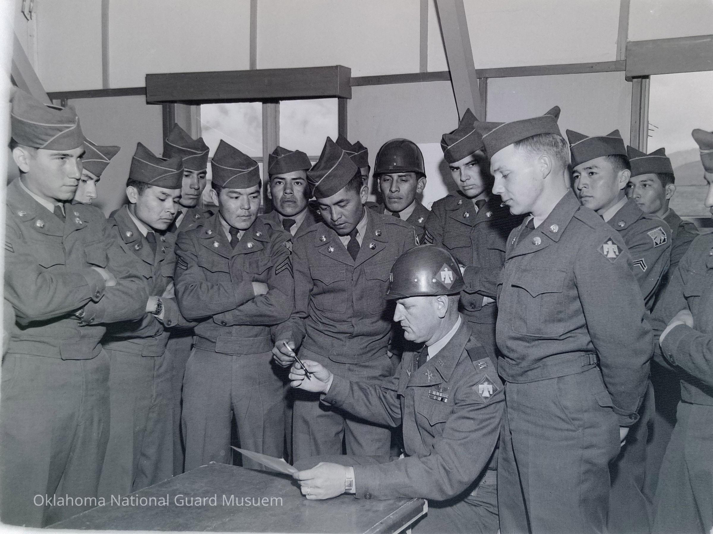 Officer signing a form among a group of Native American troops