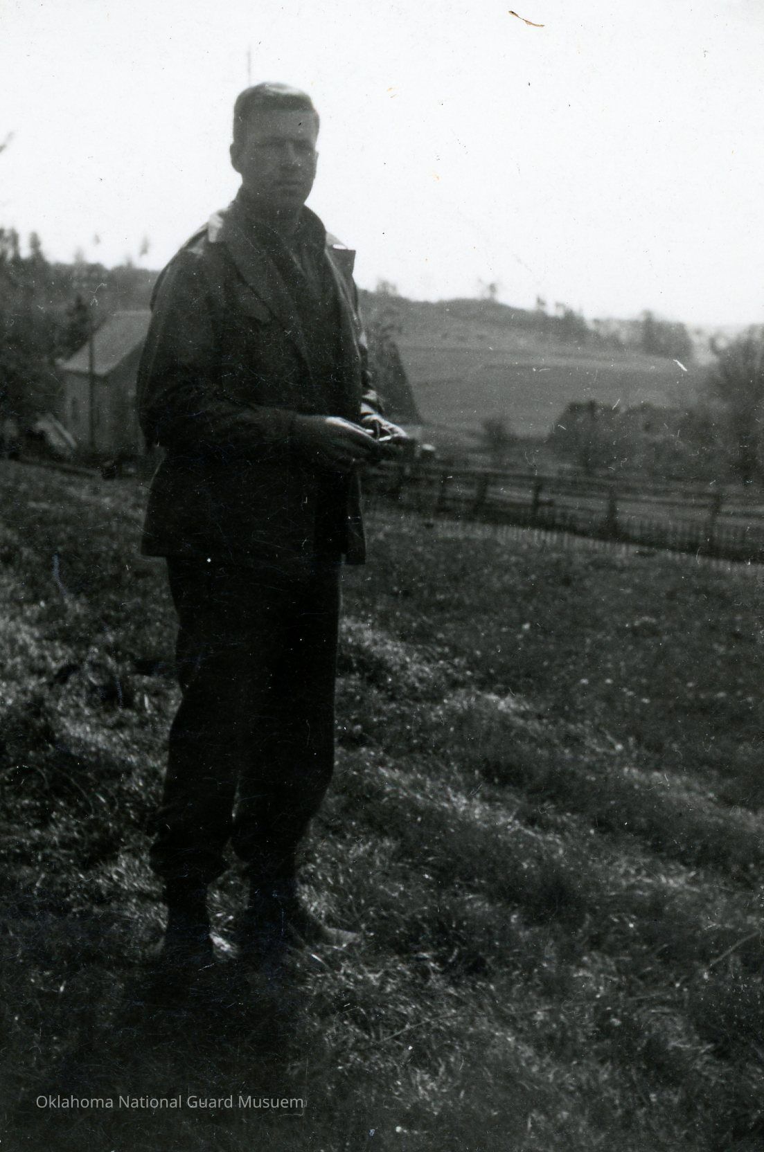 Harry Lane standing in a farm field Headquarters Battery 160th Field Artillery