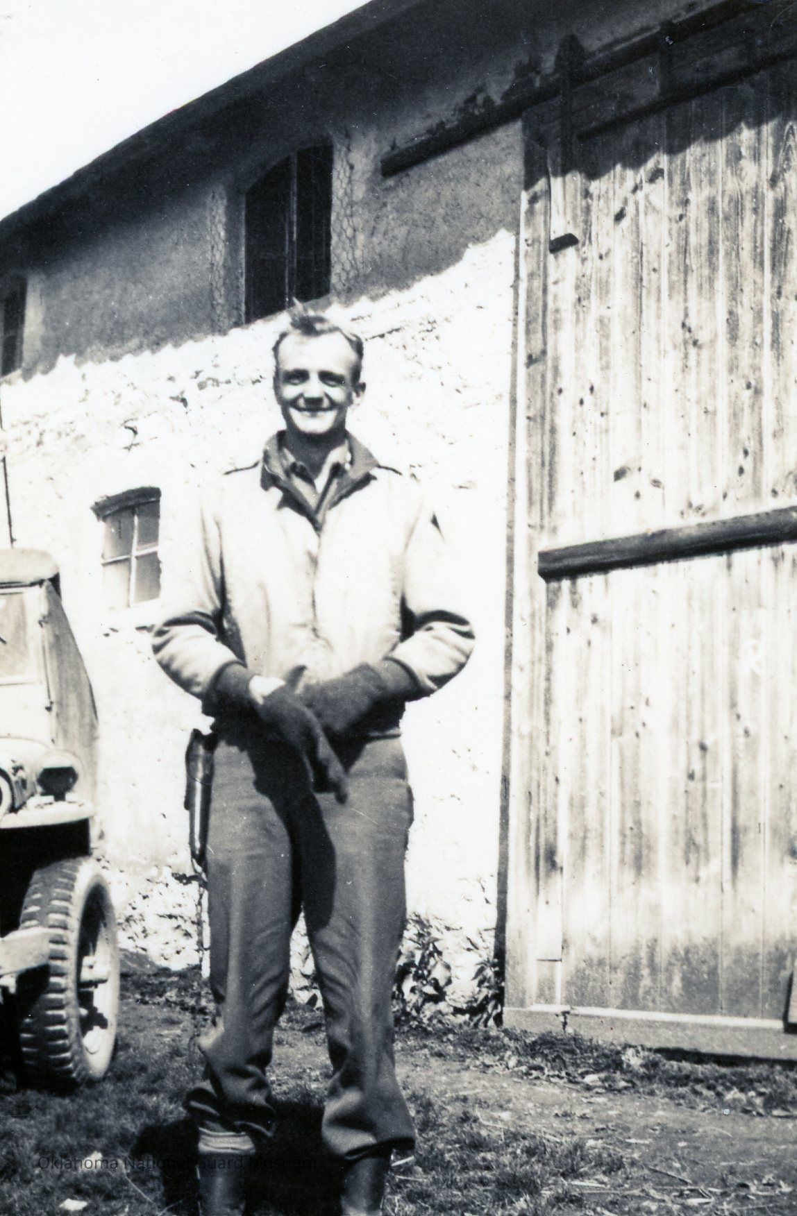 Millard Tyson standing in front of a barn Service Battery 160th Field Artillery