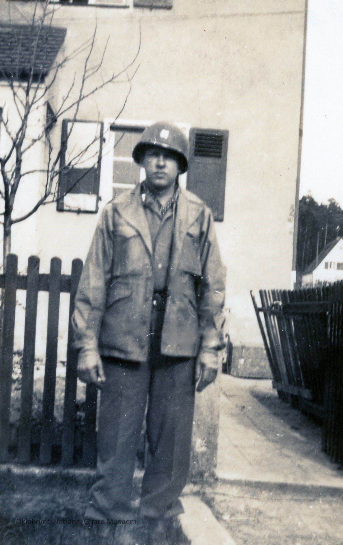 Harry Lane standing in front of a house Headquarters Battery 160th Field Artillery