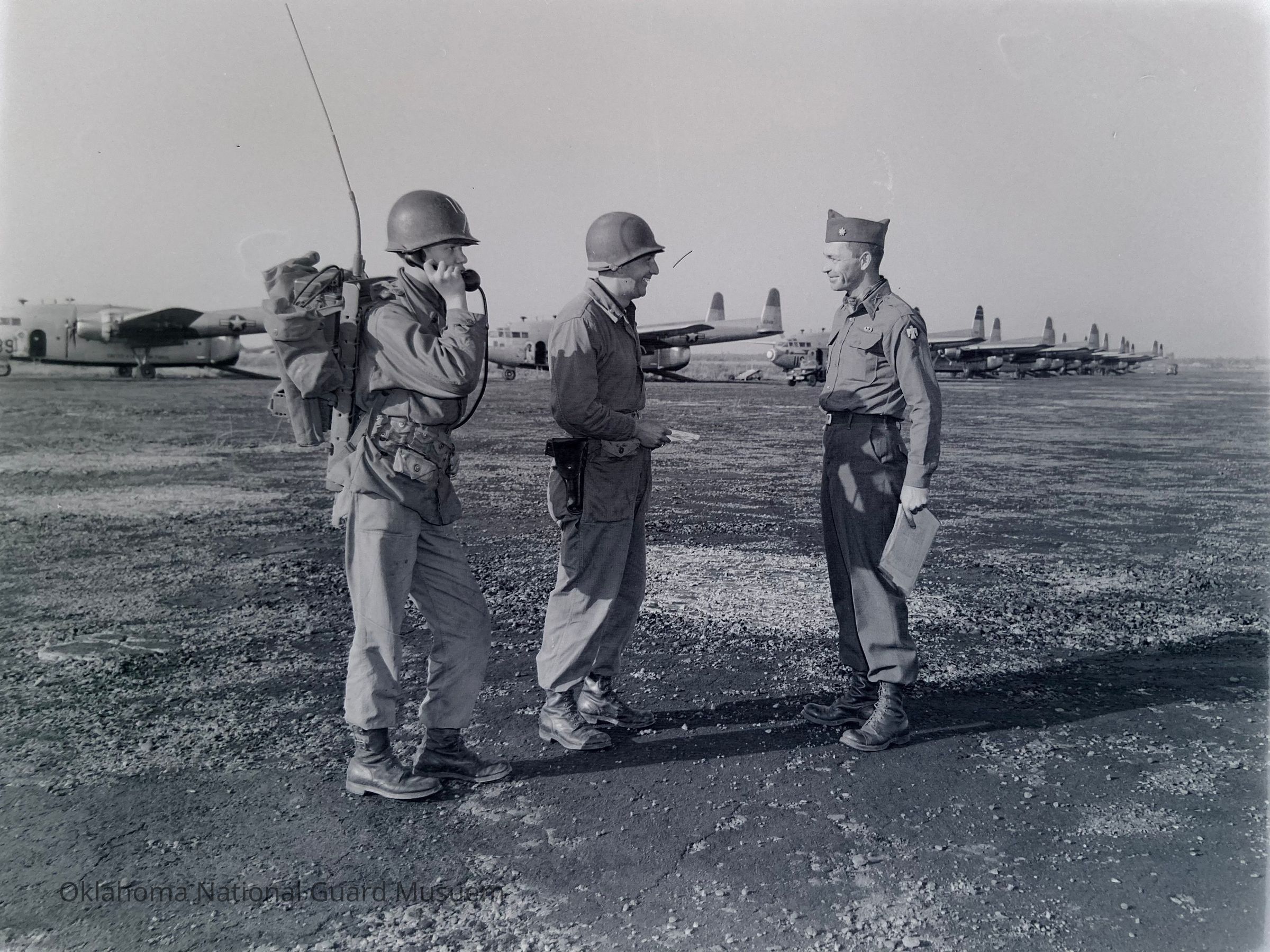 Negative of officers and radioman on flightline with aircraft in background. 45th Special Forces
