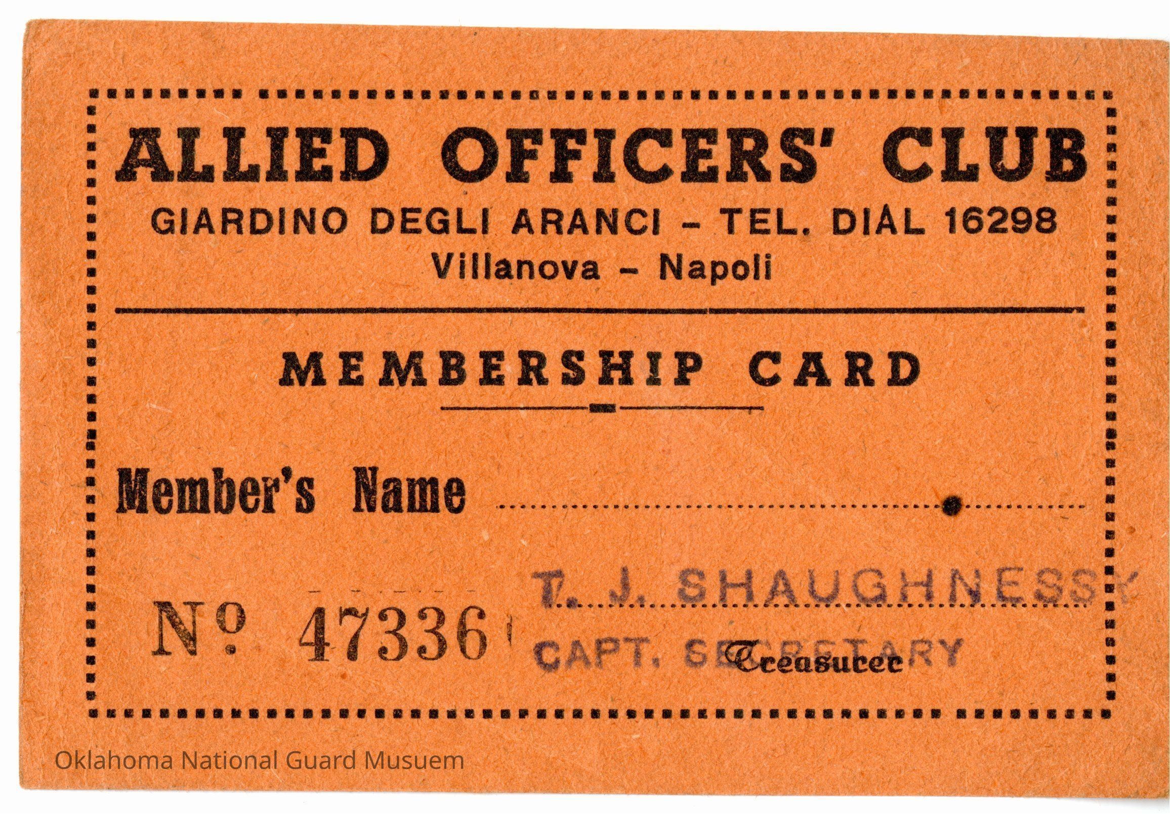 Henry B Roach (45th Division Adjutant) membership card for the Allied Officer's Club in Naples