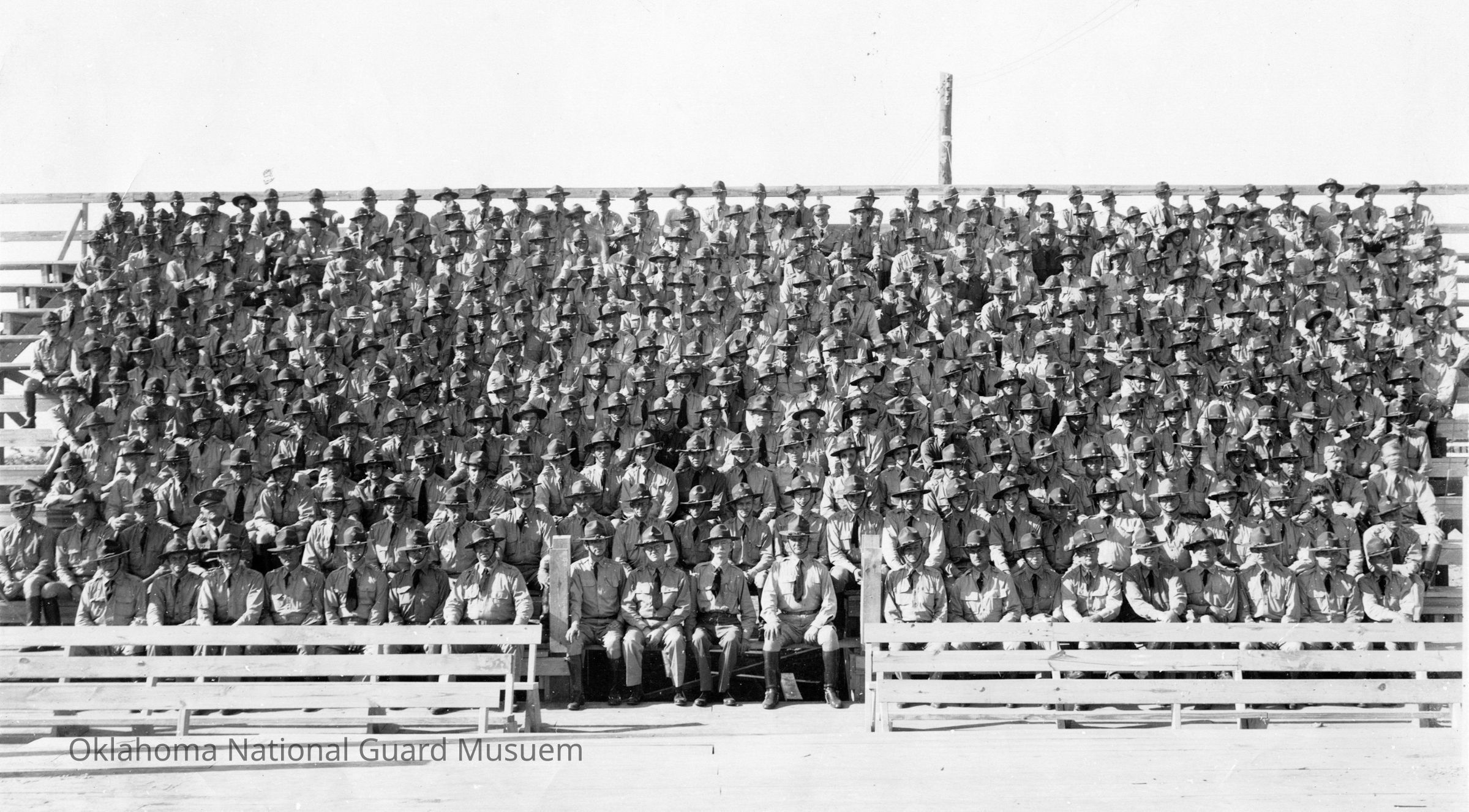 45th Division officers at annual summer camp. (First row left to right) 7th from left Charles McPherren, Raymond McLain, Alexander Tuthill, Charles Barrett, and William Key