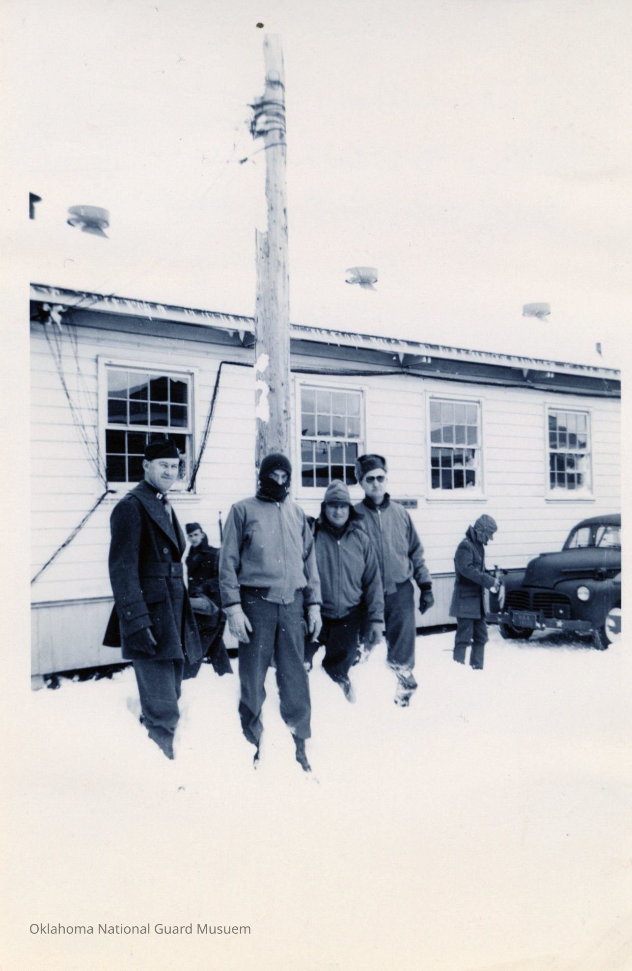 Byron Gregory, Henry B. Roach, John McCasland, and McIntire posing in front of building in the snow