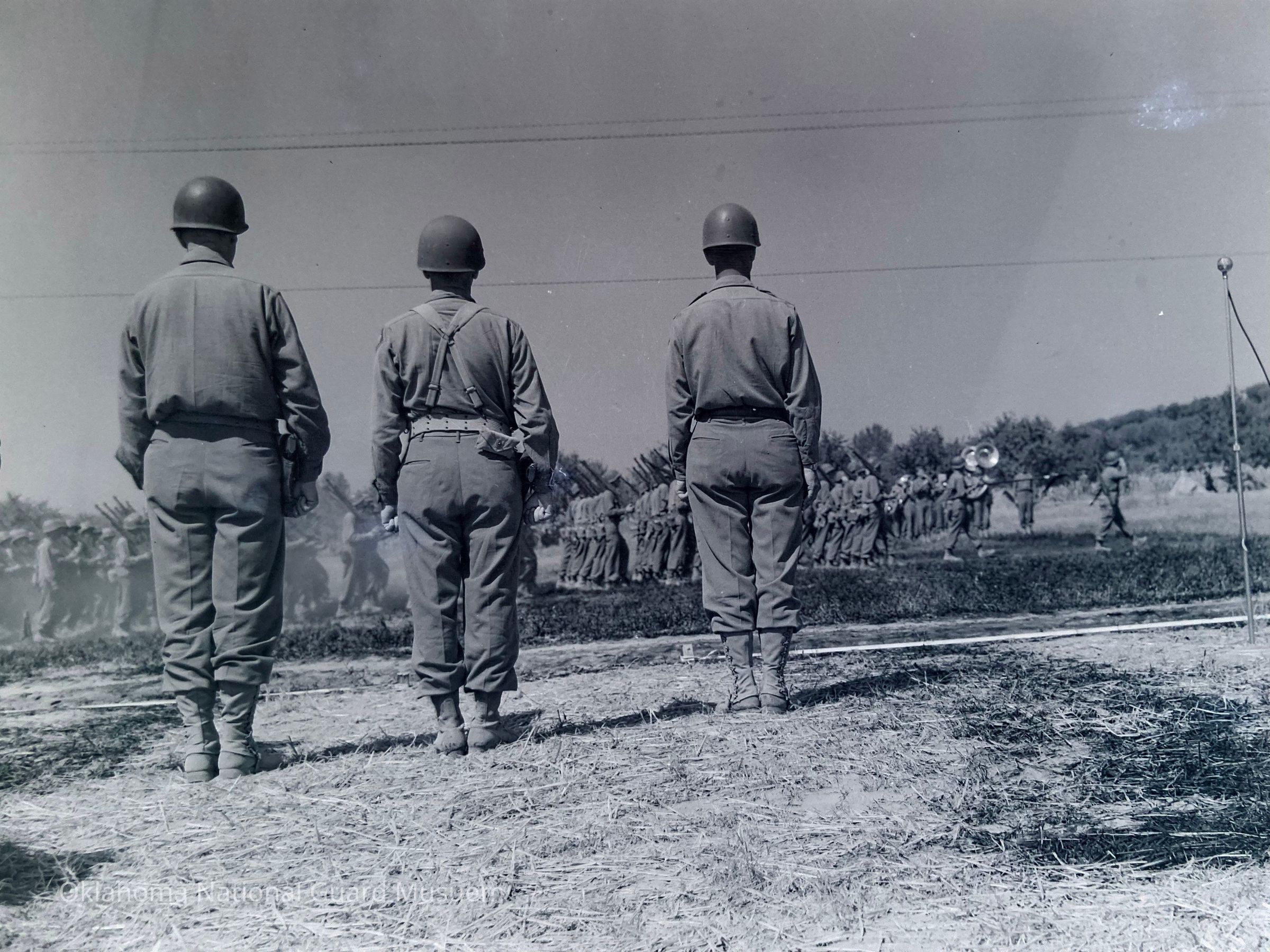 Negative of General Eagles and Colonel Dulaney (commanding officer of 180th Infantry) reviewing parading troops