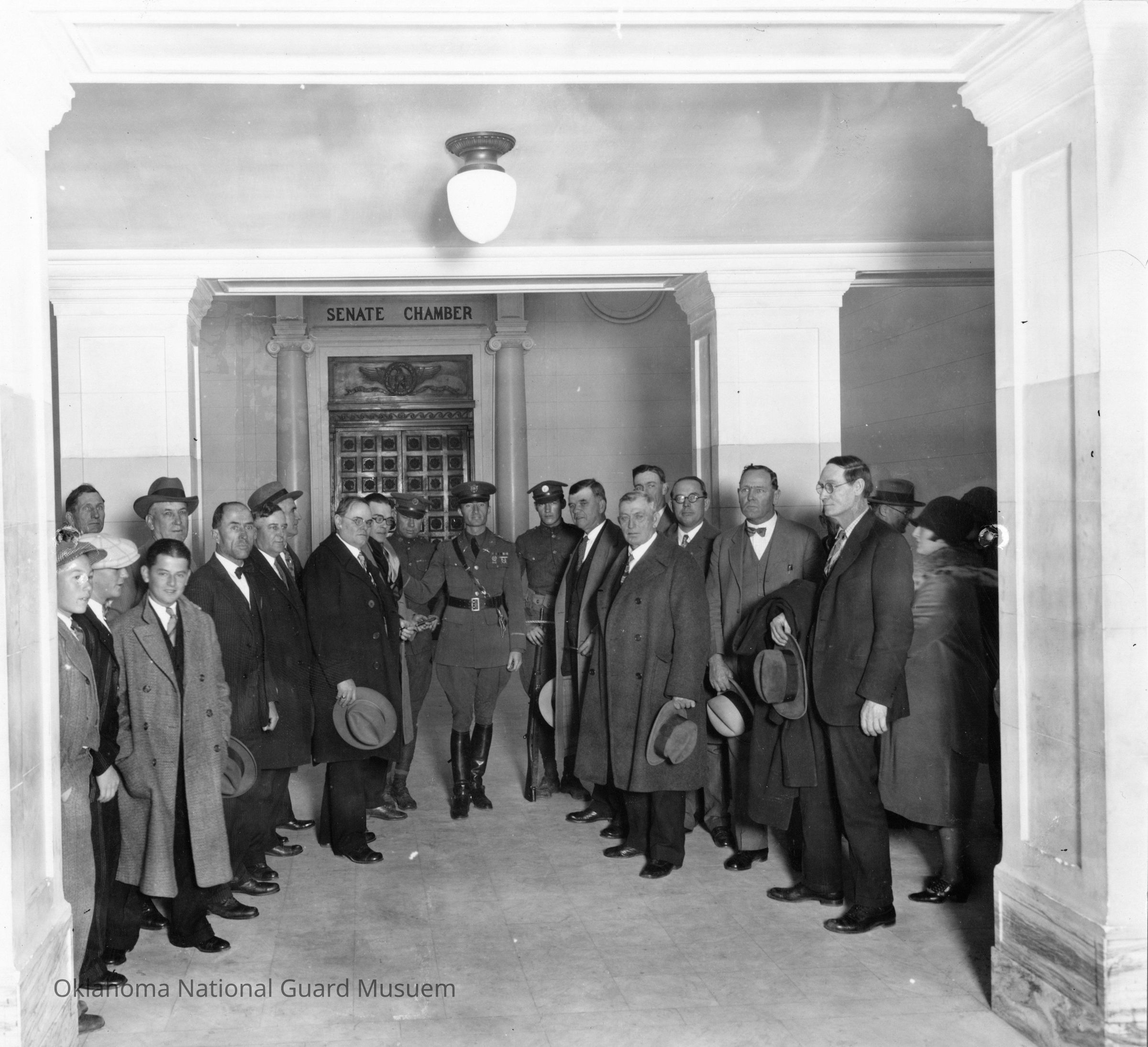 Oklahoma Guardsmen guard Senate Chamber Door during Governor Henry S. Johnston's impeachment