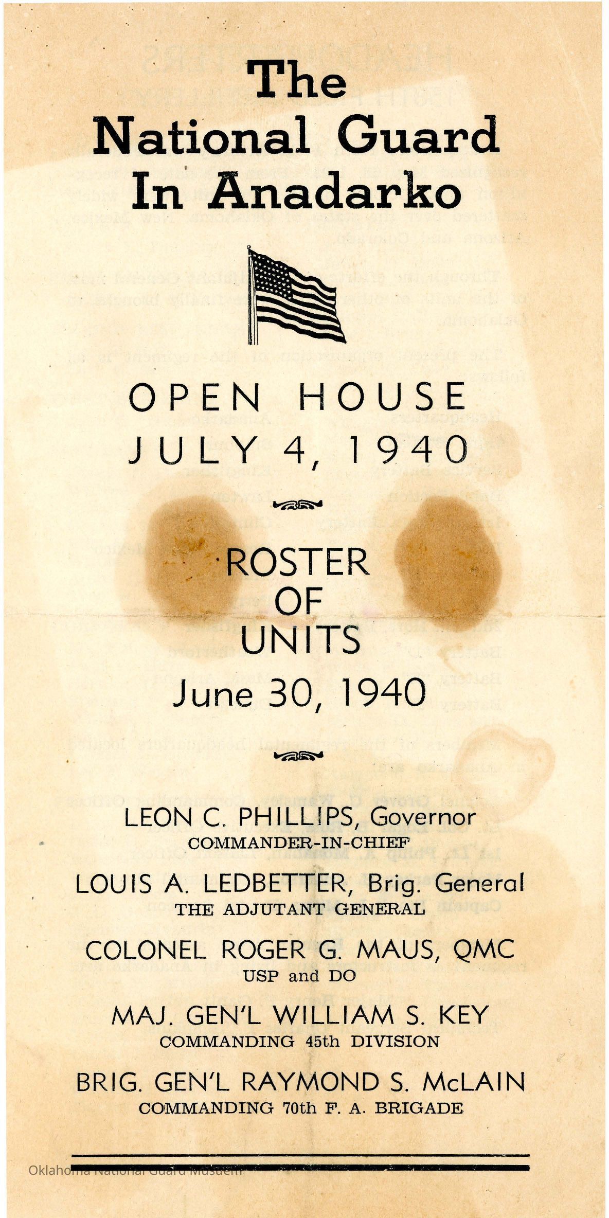 Open House Program for the armory in Anadarko with a roster. 158th Field Artillery and 120th Quartermaster Regiment