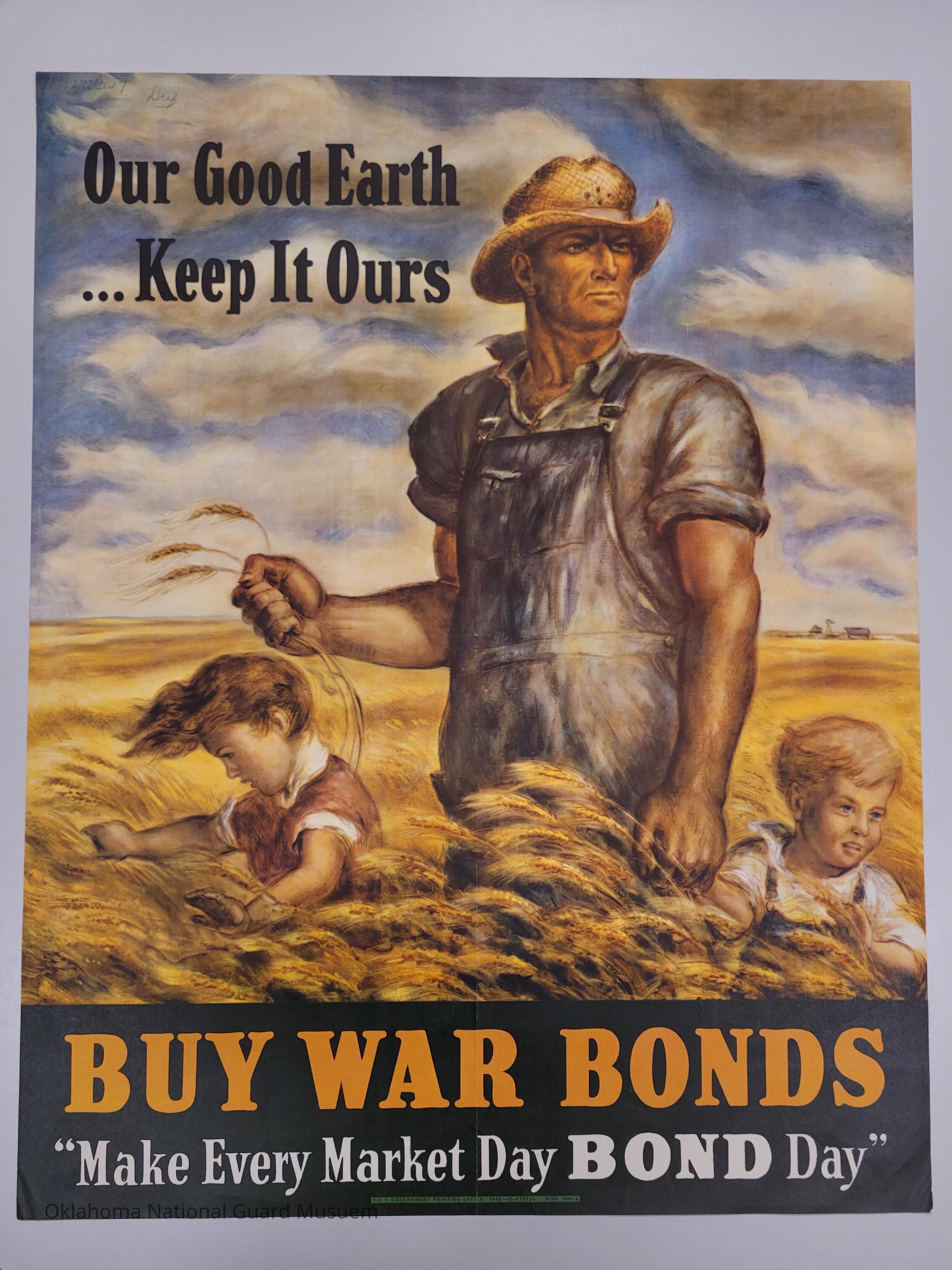 Figure of a white farmer standing in his fields flanked by two children who represent the future. The painting symbolizes the power of American agriculture to feed soldiers fighting to defend the country for future generations. For the poster, the government reproduced the painting with the caption, “Our Good Earth—Keep it Ours,” underscoring both U.S. nationalism and adding an element of threatCollection