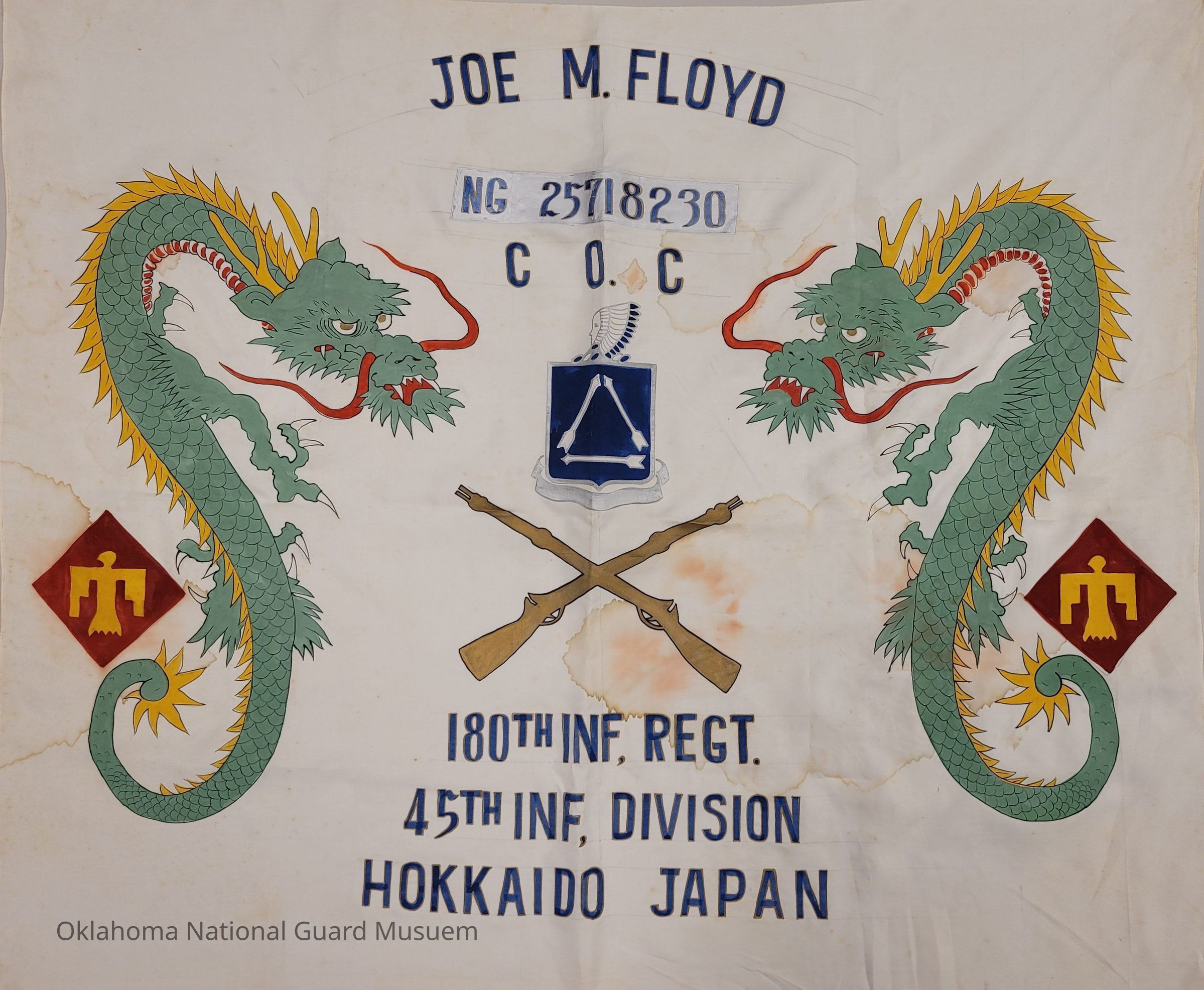 Flag with painted dragons and Thunderbirds honors Company C 180th Infantry soldier Joe M. Floyd