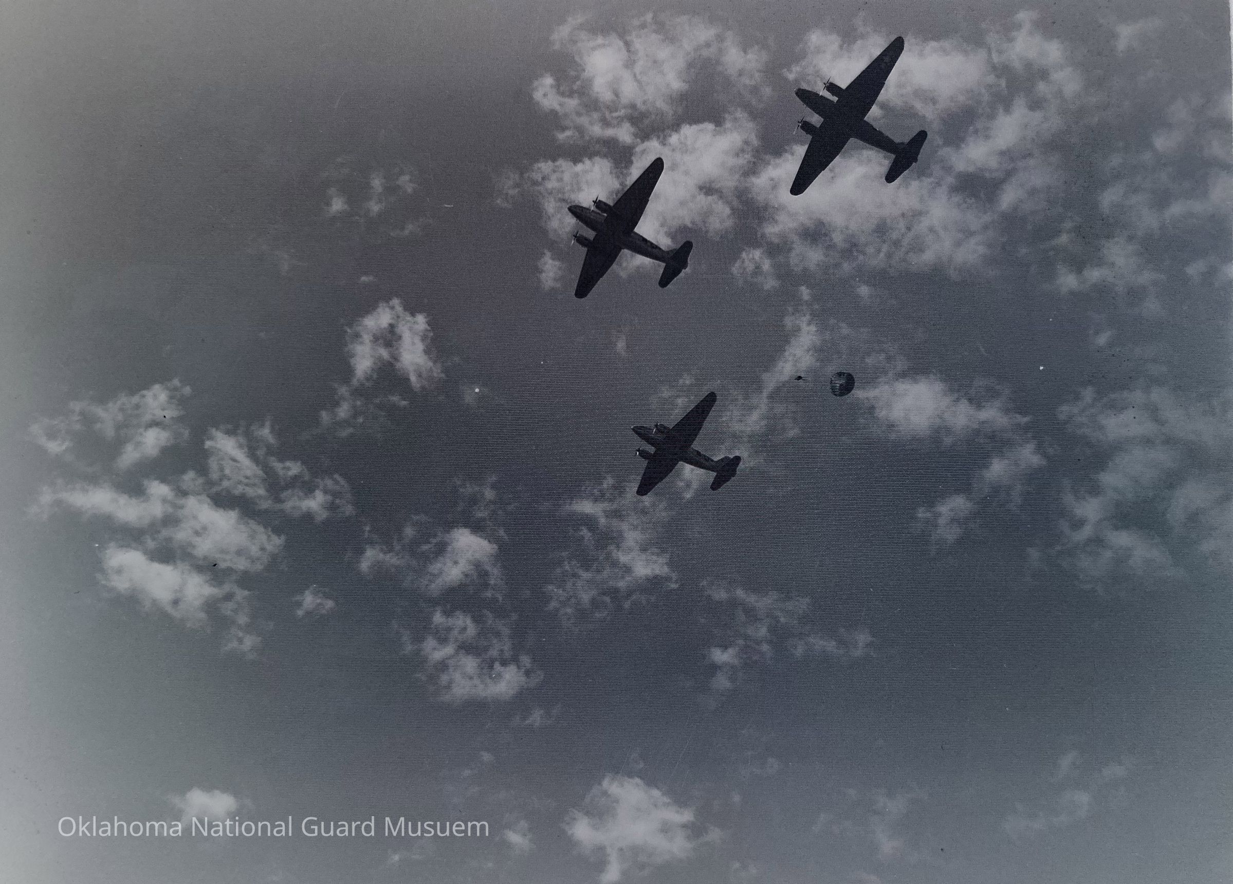 Negative of a paratrooper jumping from aircraft on Hokkaido, Japan. 45th Special Forces