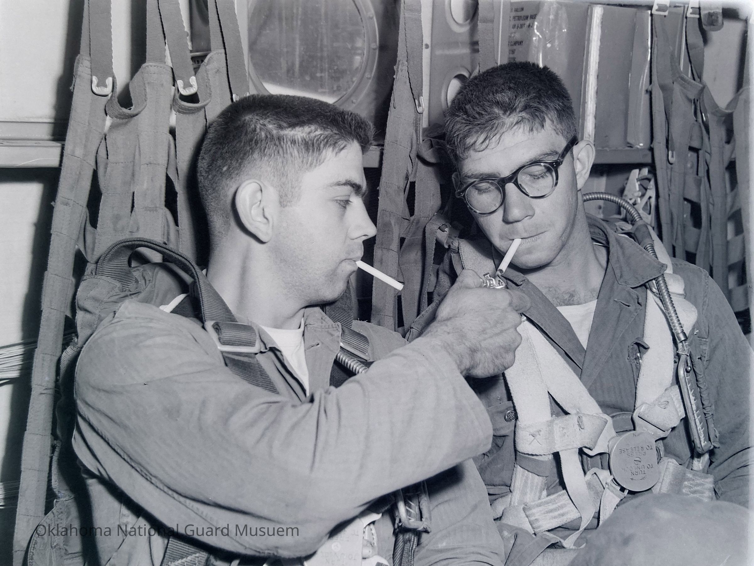 Negative of paratroopers having a cigarette inside aircraft on Hokkaido, Japan. 45th Special Forces
